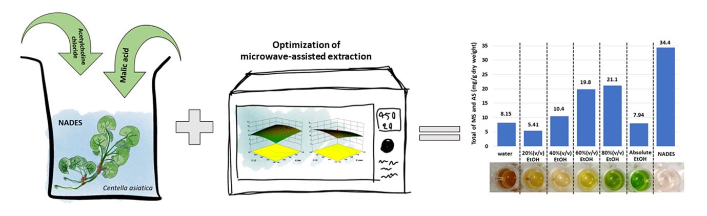 การสกัดใช้ตัวทำละลายยูเทคติกธรรมชาติและการสกัดด้วยไมโครเวฟเพื่อให้ได้สารสกัดที่มีเอเชียติโคไซด์ (asiaticoside) และมาเดคาสโซไซด์สูงและมีฤทธิ์ต้านอนุมูลอิสระสูง ตัวทำละลายยูเทคติกธรรมชาติประกอบด้วย acetylcholine chloride กรดมาลิก และน้ำ มีประสิทธิภาพการสกัดดีที่สุด สกัดสารมาเดคาสโซไซด์ได้ 21.7 มก./ก. และสารเอเชียติโคไซด์ 12.7 มก./ก. ผงแห้งบัวบก การสกัดมีประสิทธิภาพมากกว่าตัวทำละลาย 80% เอทานอล นอกจากนี้สารสกัดจากกระบวนการนี้ยังมีฤทธิ์ต้านอนุมูลอิสระสูงกว่าสารสกัดที่เตรียมโดยใช้น้ำและเอทานอล นอกจากนี้สีของผลิตภัณฑ์สกัดไม่มีสีเขียวของคลอโรฟิลล์ปนเปื้อน การศึกษาพื้นที่ผิวผิวตอบสนองวิเคราะห์ข้อมูลด้วย design expert ปัจจัยที่มีต่อการสกัดเป็นแบบจำลองกำลังสอง การตรวจสอบแบบจำลองแสดงให้เห็นความแม่นยำมากกว่า 80% งานวิจัยนี้นำเสนอกระบวนการสีเขียวที่มีประสิทธิภาพสำหรับการสกัดบัวบกโดยกระบวนการที่เป็นมิตรต่อสิ่งแวดล้อม คือ ใช้พลังงานเพียงเล็กน้อยและไม่มีตัวทำละลายอินทรีย์