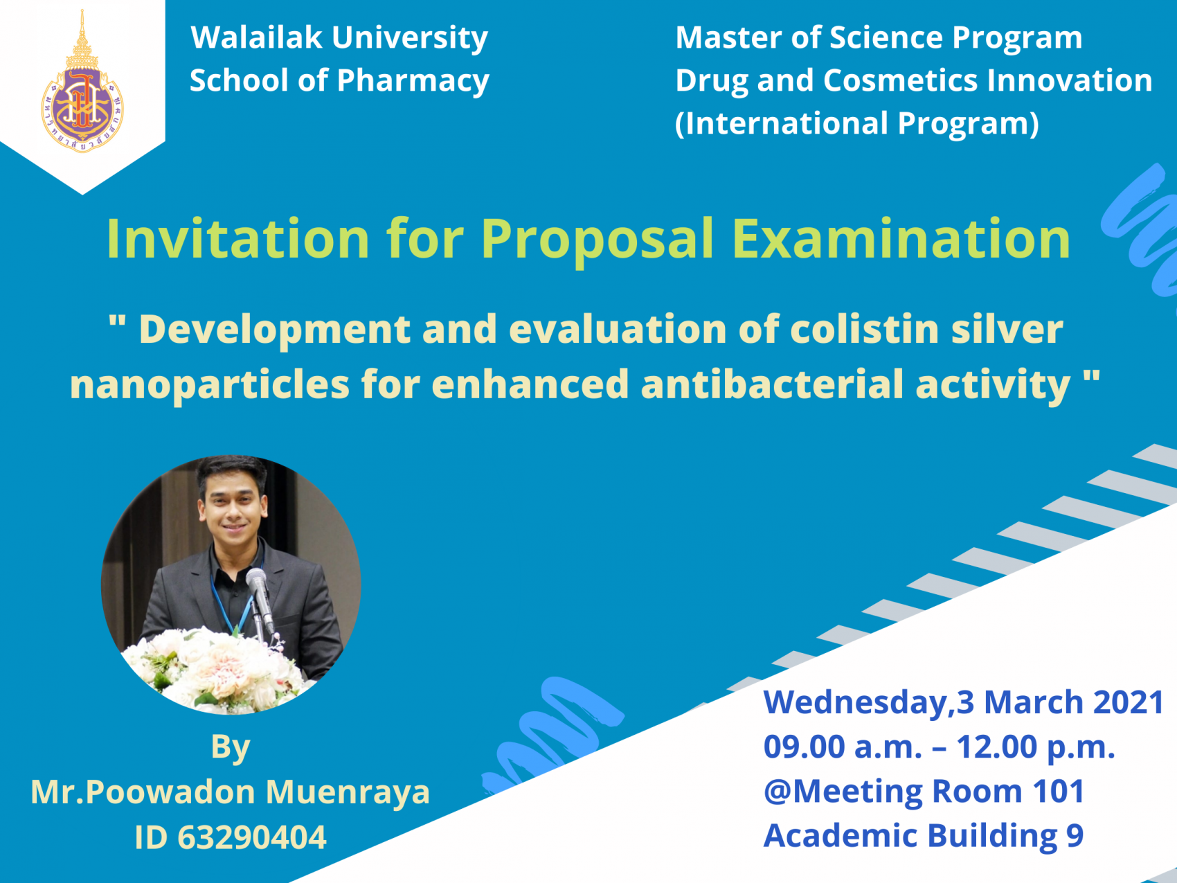 ด้วยสาขานวัตกรรมยาและเครื่องสำอาง สำนักวิชาเภสัชศาสตร์ จัดสอบวิทยานิพนธ์ให้นักศึกษาหลักสูตรวิทยาศาสตรมหาบัณฑิต สาขานวัตกรรมยาและเครื่องสำอาง จึงขอเชิญผู้สนใจเข้าร่วมฟังการสอบวิทยานิพนธ์ของนายภูวดล หมื่นระย้า หัวข้อวิทยานิพนธ์ การพัฒนาและประเมินผลโคลิสตินรูปแบบอนุภาคซิลเวอร์ในระดับนาโนเพื่อเพิ่มประสิทธิภาพในการยับยั้งเชื้อแบคทีเรีย (Development and evaluation of colistin silver nanoparticles for enhanced antibacterial activity) ณ ห้องประชุม 101 อาคารวิชาการ 9 ในวันพุธที่ 3 มีนาคม 2564 เวลา 09.00 -12.00 น. โดยมีผู้ช่วยศาสตราจารย์ ดร.อภิชาติ อธิไภริน เป็นอาจารย์ที่ปรึกษาวิทยานิพนธ์หลัก และ รองศาสตร์ตราจารย์ ดร.สมชาย สวัสดี เป็นอาจารย์ที่ปรึกษาวิทยานิพนธ์ร่วม