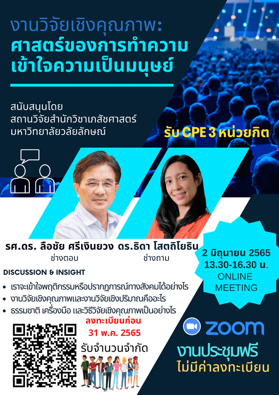 สำนักวิชาเภสัชศาสตร์ มหาวิทยาลัยวลัยลักษณ์ และสถาบันวิจัยสำนักวิชาเภสัชศาสตร์ ขอเชิญคณาจารย์ นักวิจัย นักศึกษา และผู้สนใจ ลงทะเบียนเพื่อเข้าร่วมกิจกรรมวิชาการออนไลน์ เรื่อง “งานวิจัยเชิงคณภาพ: ศาสตร์ของการทำความเข้าใจความเป็นมนุษย์” โดยวิทยากรคือ รองศาสตราจารย์ ดร.ลือชัย ศรีเงินยวง ผู้อำนวยการศูนย์จิตตปัญญา มหาวิทยาลัยมหิดล ผู้เชี่ยวชาญ โดยมีอาจารย์ ดร. เภสัชกรหญิง ธิดา โสตถิโยธิน เป็นผู้ร่วมดำเนินรายการ โดยจัดให้มีผ่านระบบ ZOOM Meeting แบบออนไลน์ ในวันที่ 2 มิถุนายน 2565 เวลา 13.30 – 16.30 น. ผู้สนใจสามารถ Scan QR code และลงทะเบียนล่วงหน้าได้ ตั้งแต่บัดนี้ จนถึงวันที่ 31 พฤษภาคม 2565 งานนี้ฟรี และไม่มีค่าลงทะเบียน (รับจำนวนจำกัด)