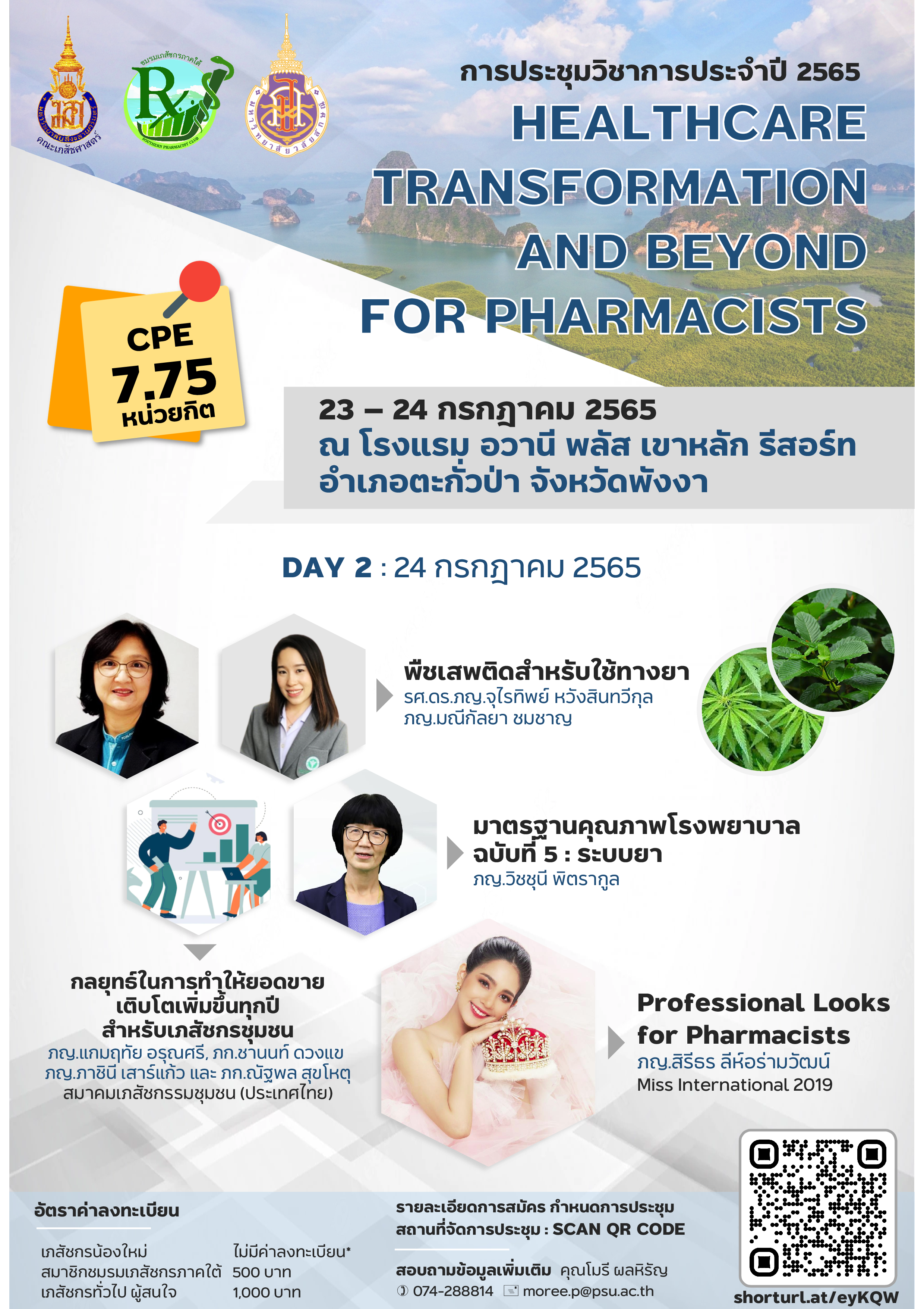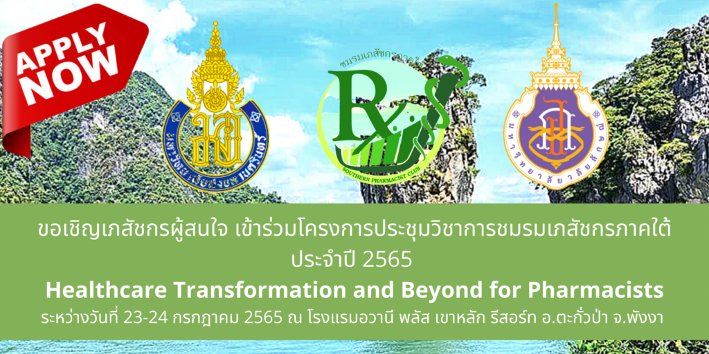 ชมรมเภสัชกรภาคใต้ ร่วมกับ คณะเภสัชศาสตร์ ม.สงขลานครินทร์ และสำนักวิชาเภสัชศาสตร์ ม.วลัยลักษณ์ ขอเชิญเภสัชกรผู้สนใจ เข้าร่วมโครงการประชุมวิชาการชมรมเภสัชกรภาคใต้ ประจำปี 2565 Healthcare Transformation and Beyond for Pharmacists ระหว่างวันที่ 23-24 กรกฎาคม 2565 ณ โรงแรมอวานี พลัส เขาหลัก รีสอร์ท อ.ตะกั่วป่า จ.พังงา