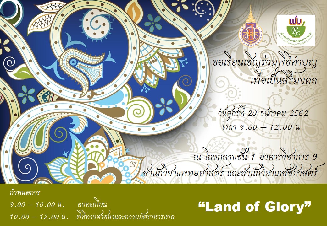 สำนักวิชาแพทยศาสตร์ และสำนักวิชาเภสัชศาสตร์ จัดกิจกรรมทำบุญเพื่อเป็นสิริมงคล ในวันศุกร์ที่ 20 ธันวาคม 2562 เวลา 9.00 – 12.00 น. โดยประมาณ จึงขอเรียนเชิญบุคลากร และนักศึกษาเข้าร่วมกิจกรรมดังกล่าวโดยพร้อมเพรียง
