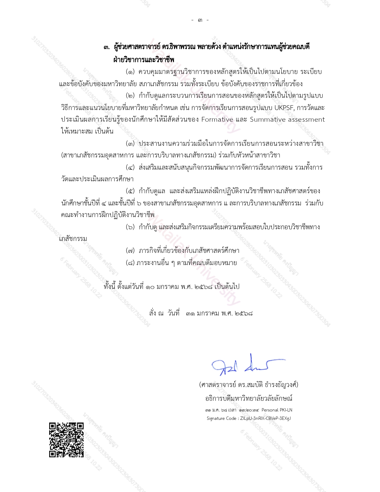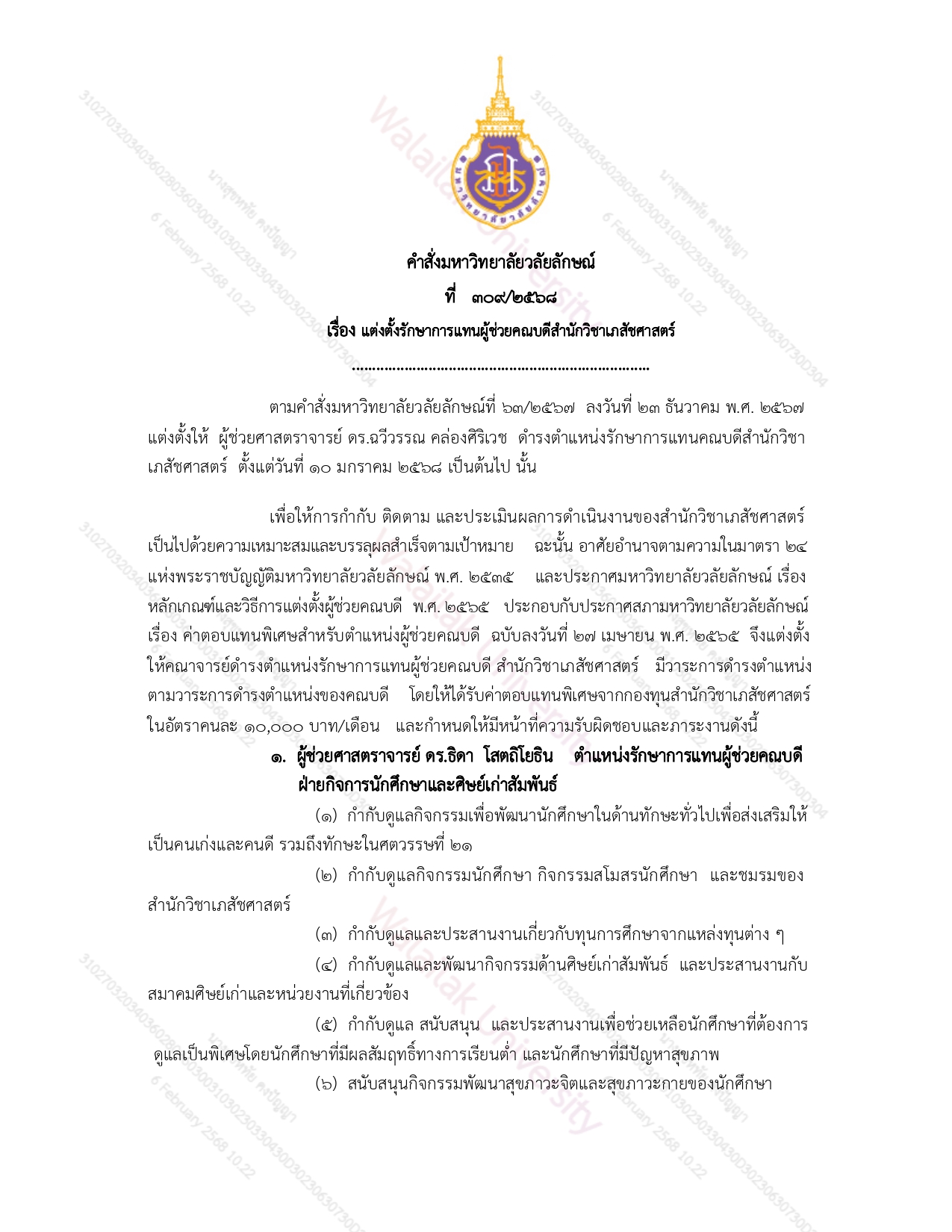 ตามคำสั่งมหาวิทยาลัยวลัยลักษณ์ ที่ 309 / 2568 เรื่อง แต่งตั้งรักษาการแทนผู้ช่วยคณบดีสำนักวิชาเภสัชศาสตร์ ลงวันที่ 31 มกราคม พ.ศ. 2568 โดยมีผลย้อนหลังตั้งแต่วันที่ 10 มกราคม พ.ศ. 2568 นั้น การนี้สำนักวิชาเภสัชศาสตร์ มหาวิทยาลัยวลัยลักษณ์ ขอแนะนำผู้บริหารสำนักวิชาเภสัชศาสตร์ใหม่ ในตำแหน่ง รักษาการแทนผู้ช่วยคณบดีสำนักวิชาเภสัชศาสตร์ สำนักวิชาเภสัชศาสตร์ มหาวิทยาลัยวลัยลักษณ์ ทั้ง 3 คน ดังต่อไปนี้