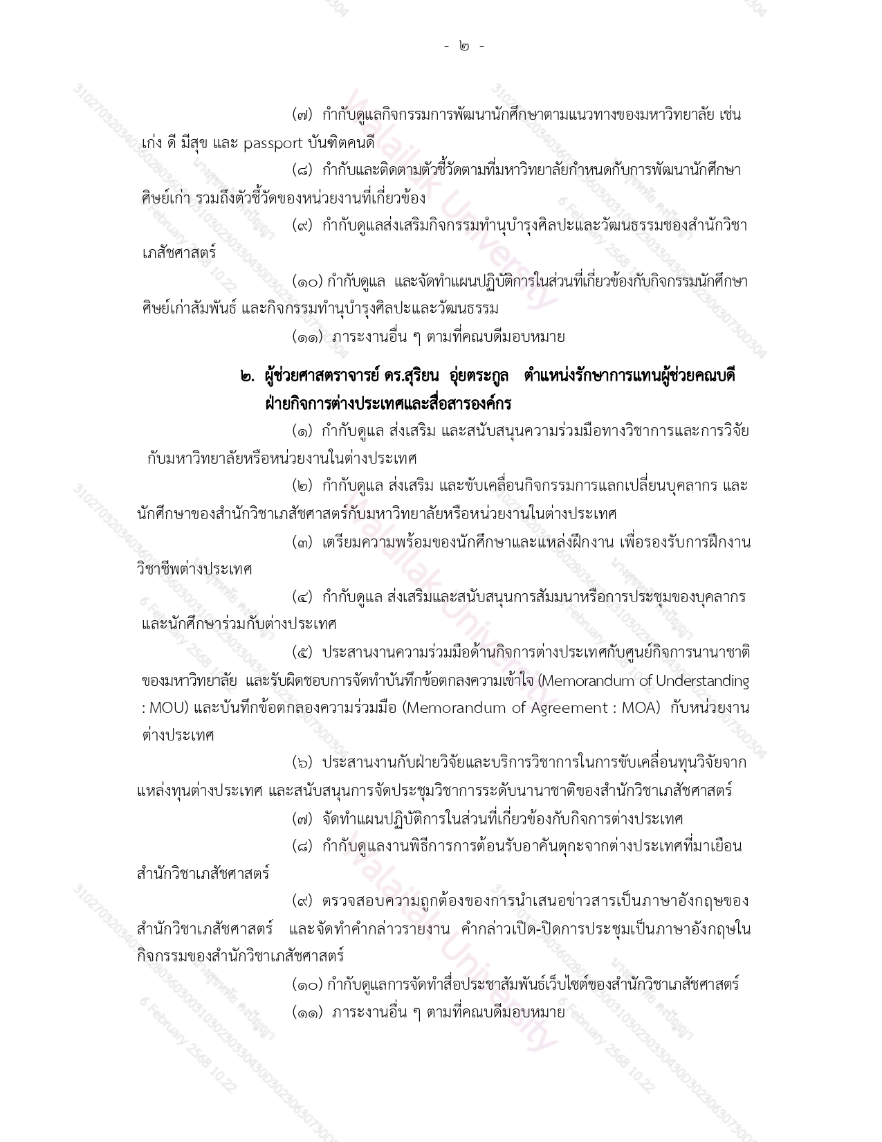 - ผู้ช่วยศาสตราจารย์ ดร. เภสัชกร สุริยน อุ่ยตระกูล ตำแหน่ง รักษาการแทนผู้ช่วยคณบดีฝ่ายกิจการต่างประเทศและสื่อสารองค์กร