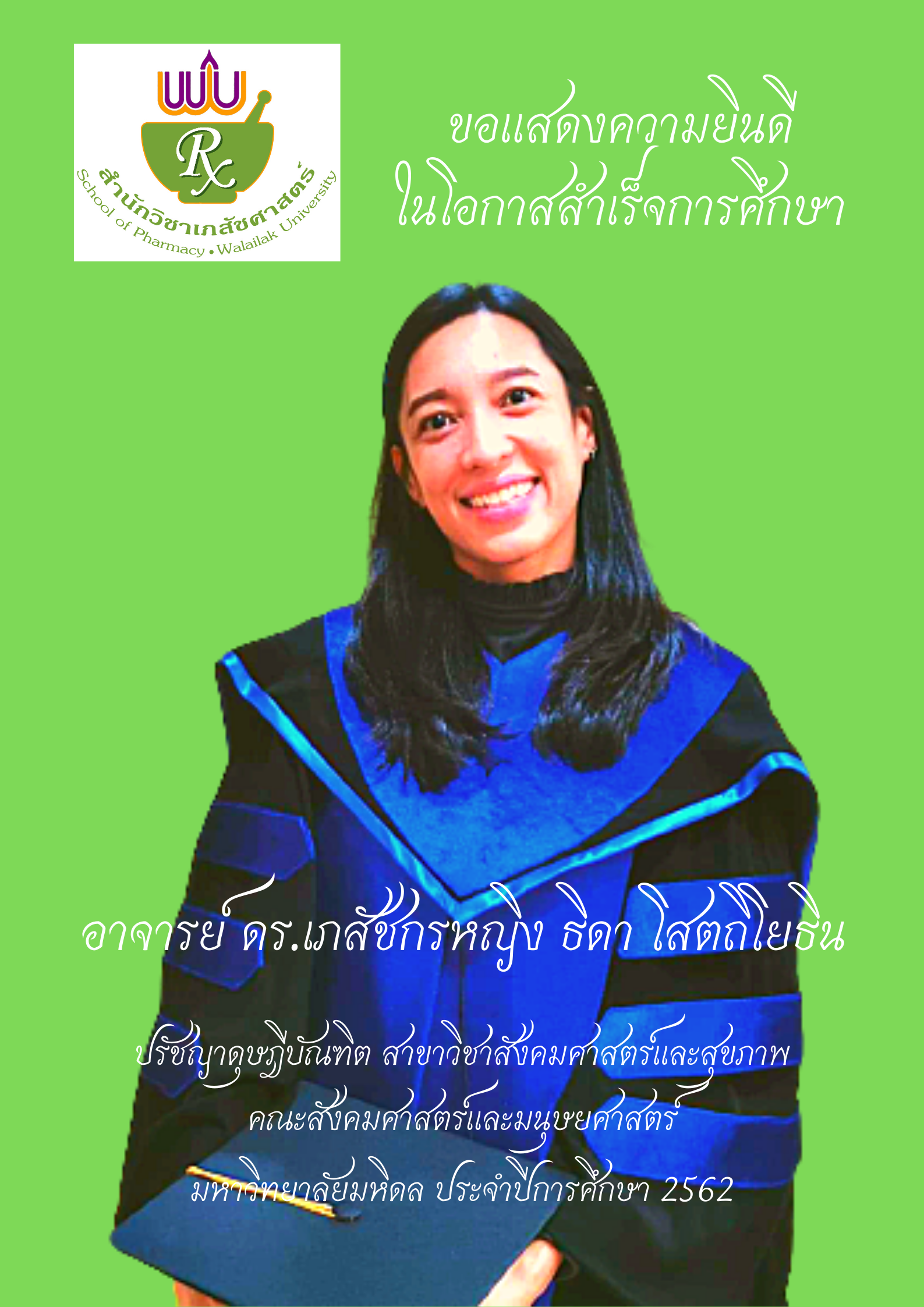 สำนักวิชาเภสัชศาสตร์ มหาวิทยาลัยวลัยลักษณ์ ขอแสดงความยินดีกับ อาจารย์ เภสัชกรหญิง ดร.ธิดา โสตถิโยธิน เนื่องในโอกาสเข้ารับพระราชทานปริญญาบัตร สำเร็จการศึกษาปรัชญาดุษฎีบัณฑิตสาขาสังคมศาสตร์และสุขภาพ หรือ Doctor of Philosophy (Social Sciences and Health) จากคณะสังคมศาสตร์และมนุษยศาสตร์ มหาวิทยาลัยมหิดล เมื่อ 7 ตุลาคม 2563 ที่ผ่านมา