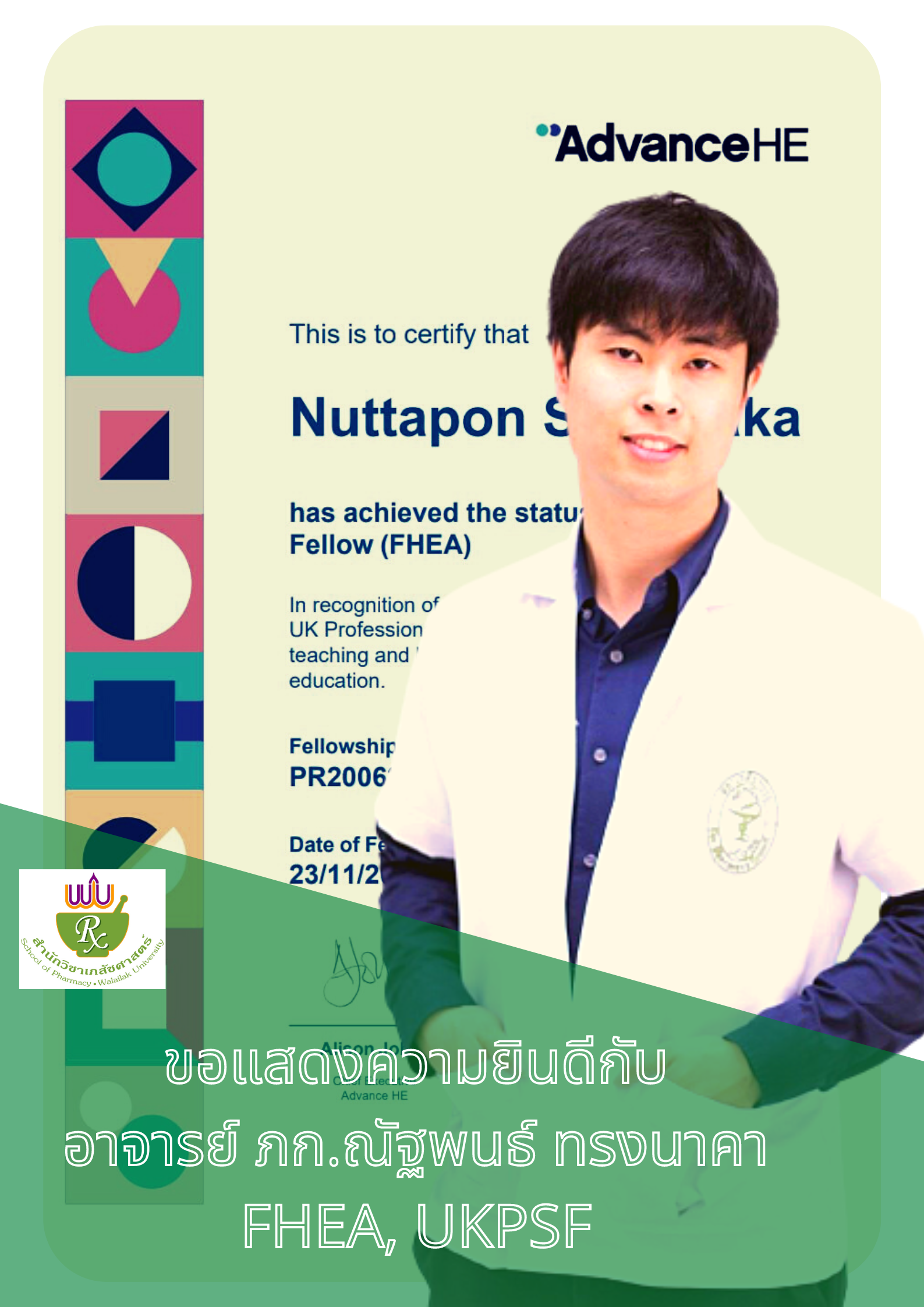 สำนักวิชาเภสัชศาสตร์ มหาวิทยาลัยวลัยลักษณ์ ขอแสดงความยินดีกับ อาจารย์ เภสัชกร ณัฐพนธ์ ทรงนาคา ตำแหน่ง อาจารย์สำนักวิชาเภสัชศาสตร์ สำนักวิชาเภสัชศาสตร์ มหาวิทยาลัยวลัยลักษณ์ ในโอกาสที่ได้รับการรับรองมาตรฐานความรู้ระดับ Fellow หรือ FHEA จาก the Higher Education Academy หรือ HEA จากประเทศอังกฤษ ใน UK Professional Standards Framework หรือ UKPSF