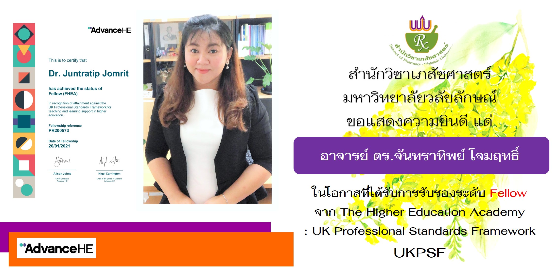 สำนักวิชาเภสัชศาสตร์ มหาวิทยาลัยวลัยลักษณ์ ขอแสดงความยินดีกับ อาจารย์ ดร.จันทราทิพย์ โจมฤทธิ์ อาจารย์ประจำ สำนักวิชาเภสัชศาสตร์ มหาวิทยาลัยวลัยลักษณ์ ในโอกาสที่ได้รับการรับรองมาตรฐานความรู้ระดับ “Fellow (FHEA)” จาก the Higher Education Academy หรือ HEA จากประเทศอังกฤษ ใน UK Professional Standard Framework หรือ UKPSF