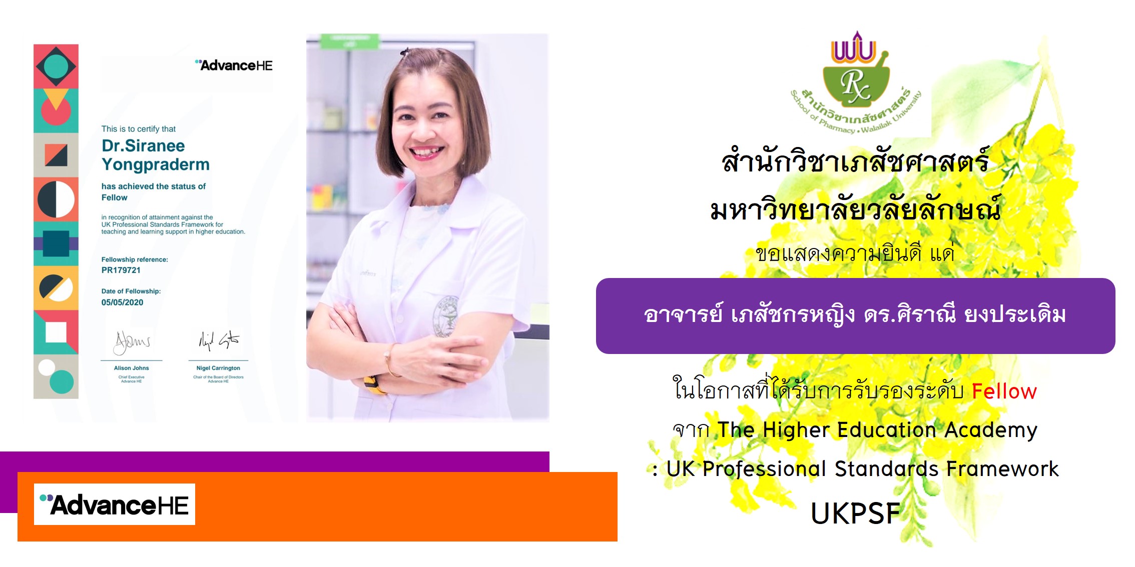 สำนักวิชาเภสัชศาสตร์ มหาวิทยาลัยวลัยลักษณ์ ขอแสดงความยินดีกับ อาจารย์ เภสัชกรหญิง ดร.ศิราณี ยงประเดิม หัวหน้าสาขาบริบาลเภสัชกรรม สำนักวิชาเภสัชศาสตร์ มหาวิทยาลัยวลัยลักษณ์ ในโอกาสที่ผ่านการรับรองมาตรฐานความรู้ระดับ “Fellow” จาก the Higher Education Academy หรือ HEA จากประเทศอังกฤษ ใน UK Professional Standard Framework หรือ UKPSF