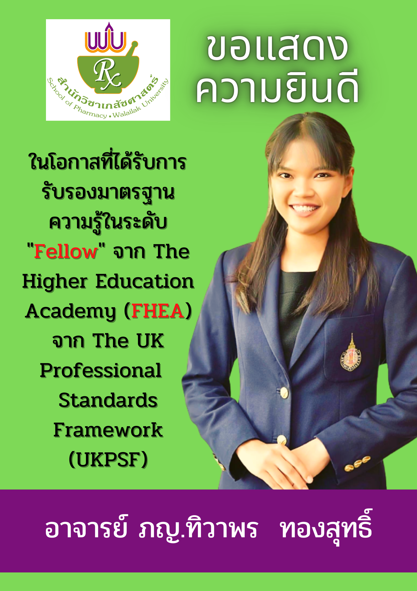 สำนักวิชาเภสัชศาสตร์ มหาวิทยาลัยวลัยลักษณ์ ขอแสดงความยินดีกับ อาจารย์ เภสัชกรหญิง ทิวาพร ทองสุทธิ์ อาจารย์สาขาบริบาลเภสัชกรรม สำนักวิชาเภสัชศาสตร์ มหาวิทยาลัยวลัยลักษณ์ ในโอกาสที่ผ่านการประเมิน และรับรองมาตรฐานความรู้ในระดับ “Fellow” จาก The Higher Education Academy (FHEA) จาก The UK Professional Standards Framework (UKPSF)