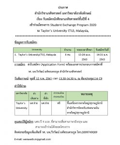 การรับสมัครนักศึกษาแลกเปลี่ยนไปศึกษาดูงานที่ Taylor’s University ประเทศมาเลเซีย ประจำปี พ.ศ. 2563 ระหว่างวันที่ 13-24 เมษายน 2563 Read More » มกราคม 14, 2020