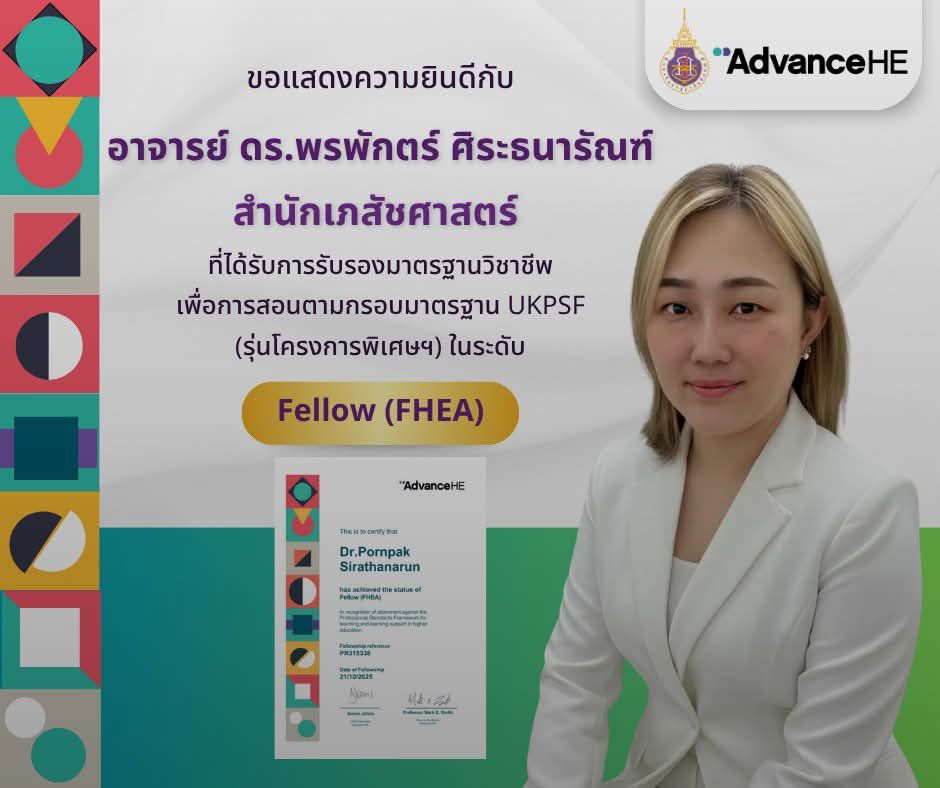 นครศรีธรรมราช – สำนักวิชาเภสัชศาสตร์ มหาวิทยาลัยวลัยลักษณ์ ขอแสดงความยินดีกับ อาจารย์ ดร.ภญ.พรพักตร์ ศิระธนารัณฑ์ ที่ได้รับการรับรองคุณวุฒิในระดับ Fellow จากโครงการ Higher Education Academy (HEA) Fellowships ประเทศสหราชอาณาจักร โดยเป็นผู้ได้รับการรับรองลำดับที่ 763 และเป็นหนึ่งในผู้สมัครใน โครงการพิเศษที่ผ่านการอบรมเฉพาะ Pre-UKPSF ลำดับที่ 524