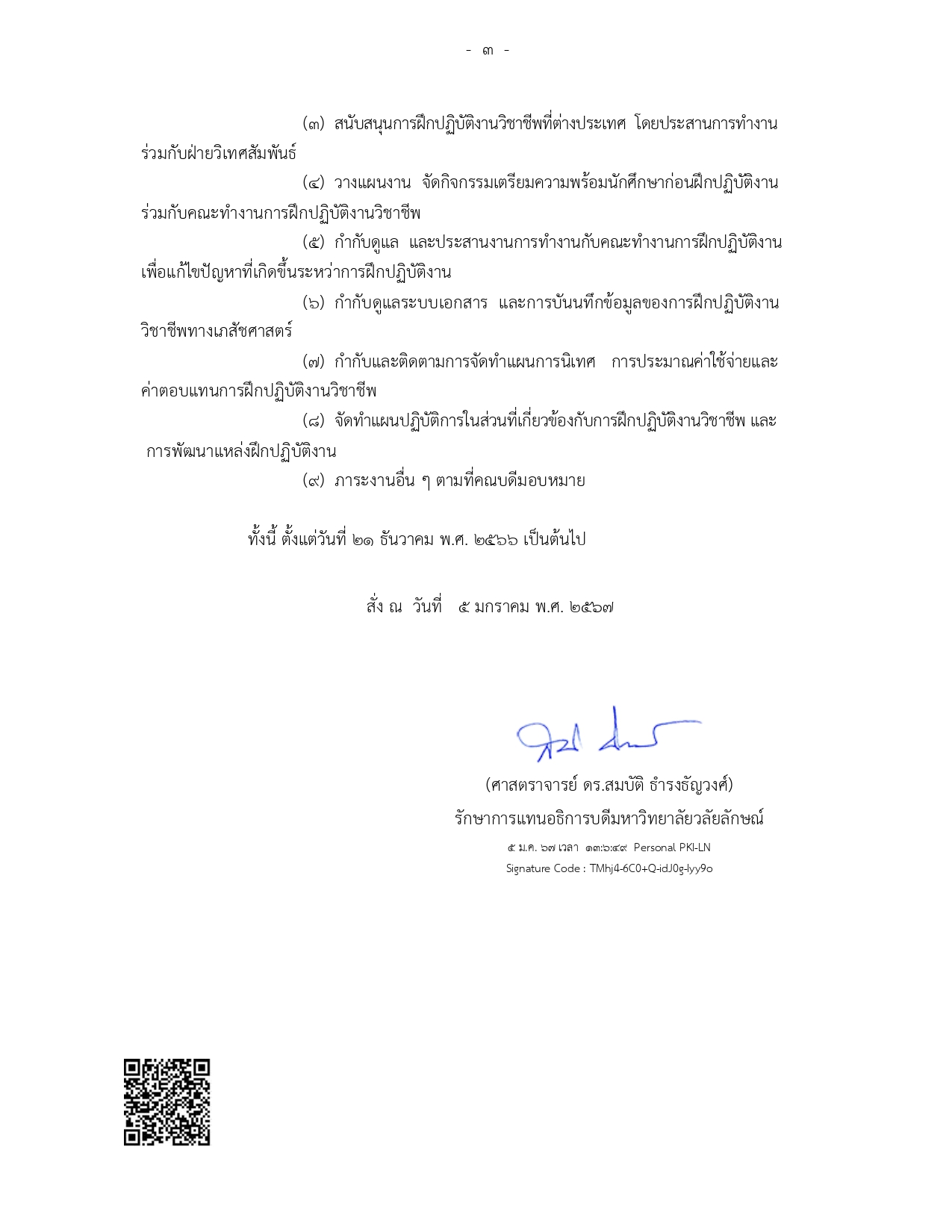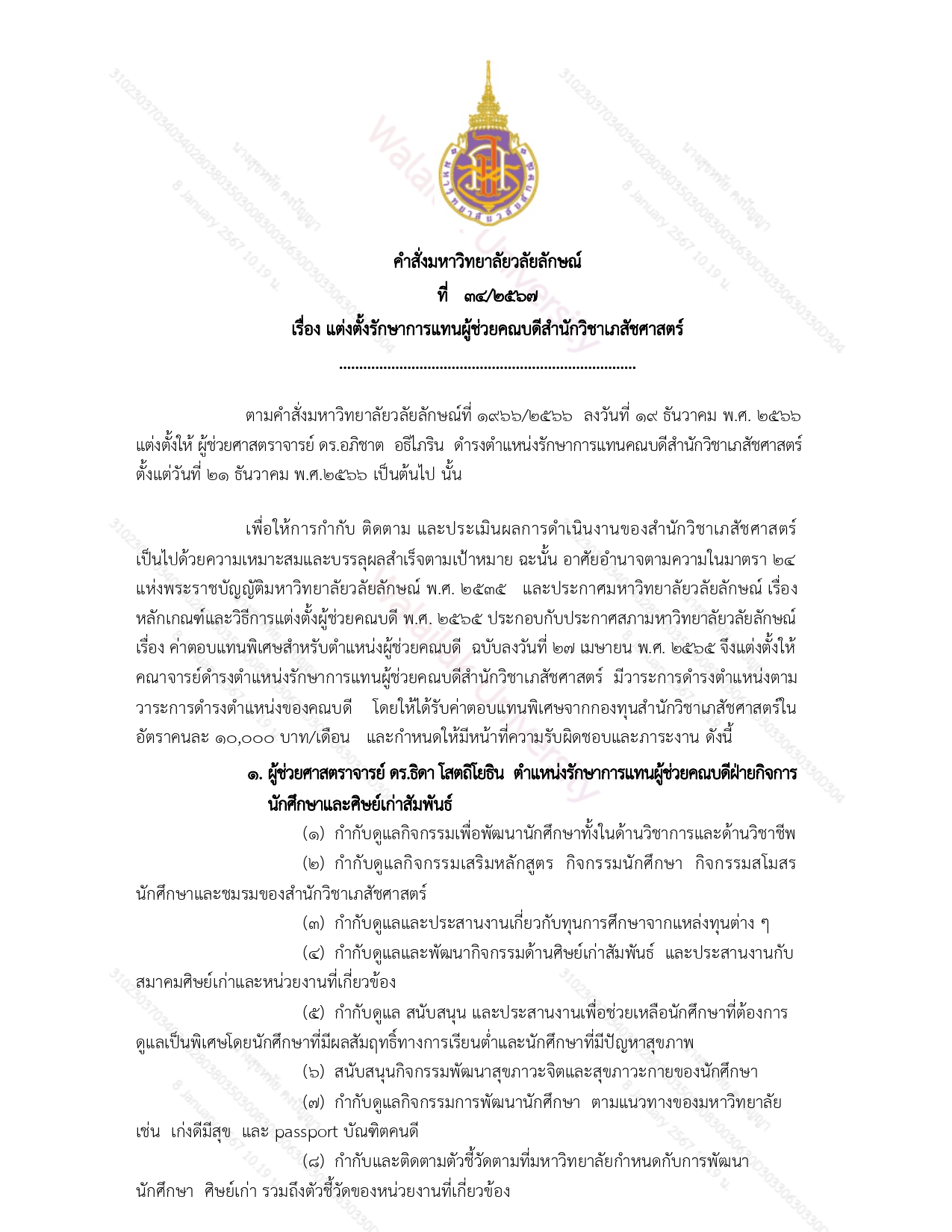 ด้วยมหาวิทยาลัยวลัยลักษณ์ได้มีคำสั่งที่ 34/2567 ลงวันที่ 5 มกราคม พ.ศ. 2567 แต่งตั้งคณาจารย์ให้ดำรงตำแหน่งรักษาการแทนผู้ช่วยคณบดีสำนักวิชาเภสัชศาสตร์ ตั้งแต่วันที่ 21 ธันวาคม 2566 เป็นต้นไป ดังนี้