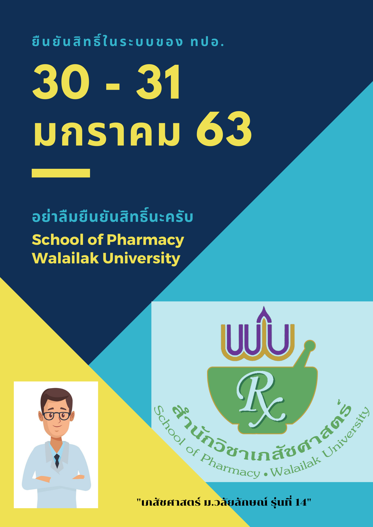 ตามที่สำนักวิชาเภสัชศาสตร์ มหาวิทยาลัยวลัยลักษณ์ ได้ดำเนินการรับสมัคร และคัดเลือกนักศึกษาเภสัชศาสตร์ ประจำปีการศึกษา 2563 หรือ WU Pharmacy TCAS63 ในรอบที่ 1 ซึ่งเป็นรอบ portfolio และได้มีการดำเนินการสอบสัมภาษณ์ และประกาศผลการคัดเลือกไปก่อนหน้านี้แล้วนั้น ซึ่งในขั้นตอนต่อไป จะเป็นการยืนยันสิทธิ์ในระบบของ ทปอ. ซึ่งผู้ผ่านการคัดเลือก จะต้องเข้าไปในระบบ (student.mytcas.com) เพื่อดำเนินการยืนยันสิทธิ์ สำหรับผู้ที่ต้องการสละสิทธิ์ สามารถทำได้ในระบบเช่นกัน ในระหว่างวันที่ 1 – 2 กุมภาพันธ์ 2563 ก่อนที่จะชำระเงินยืนยันสิทธิ์เข้าศึกษาฯ ในวันที่ 4 กุมภาพันธ์ 2563