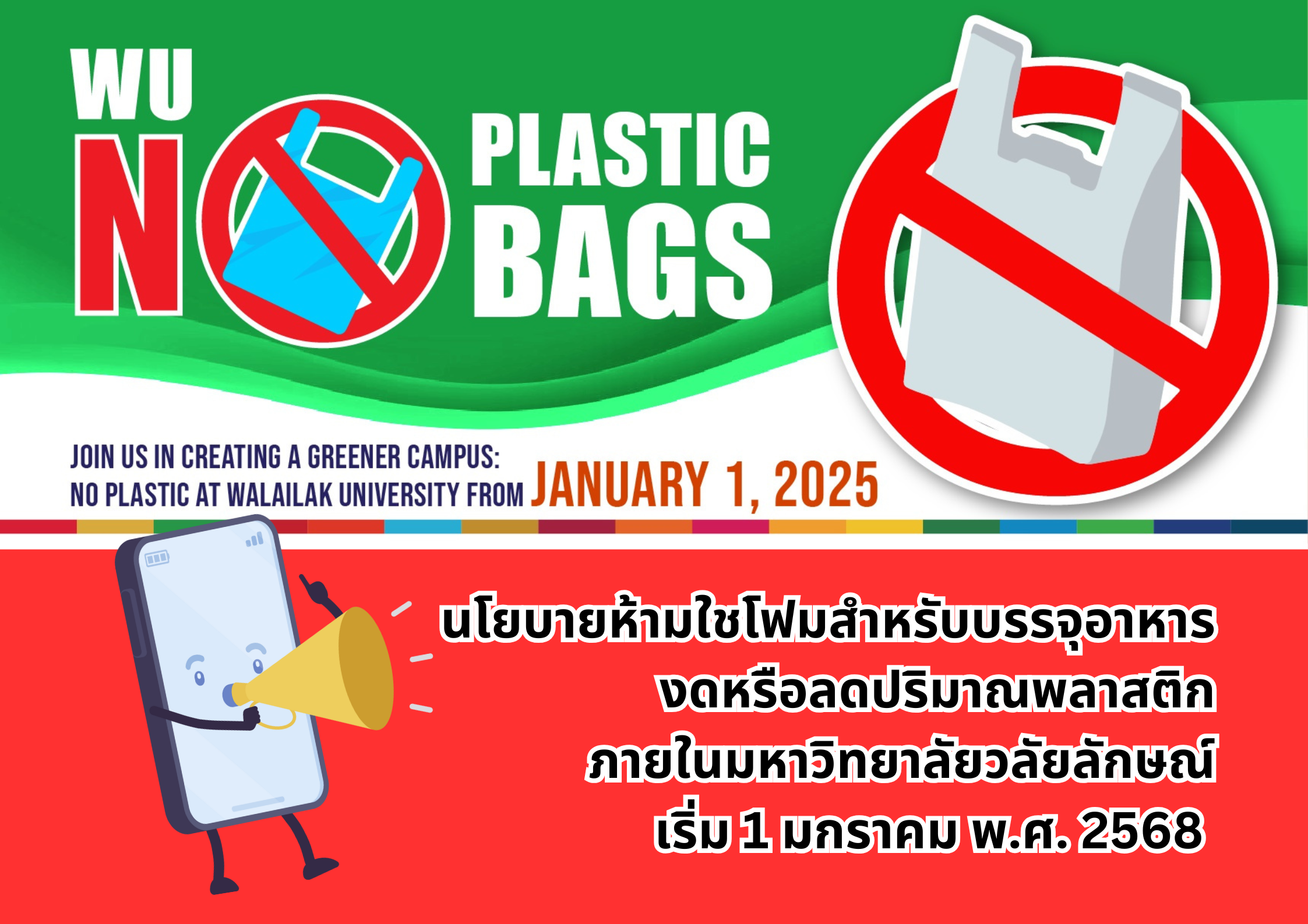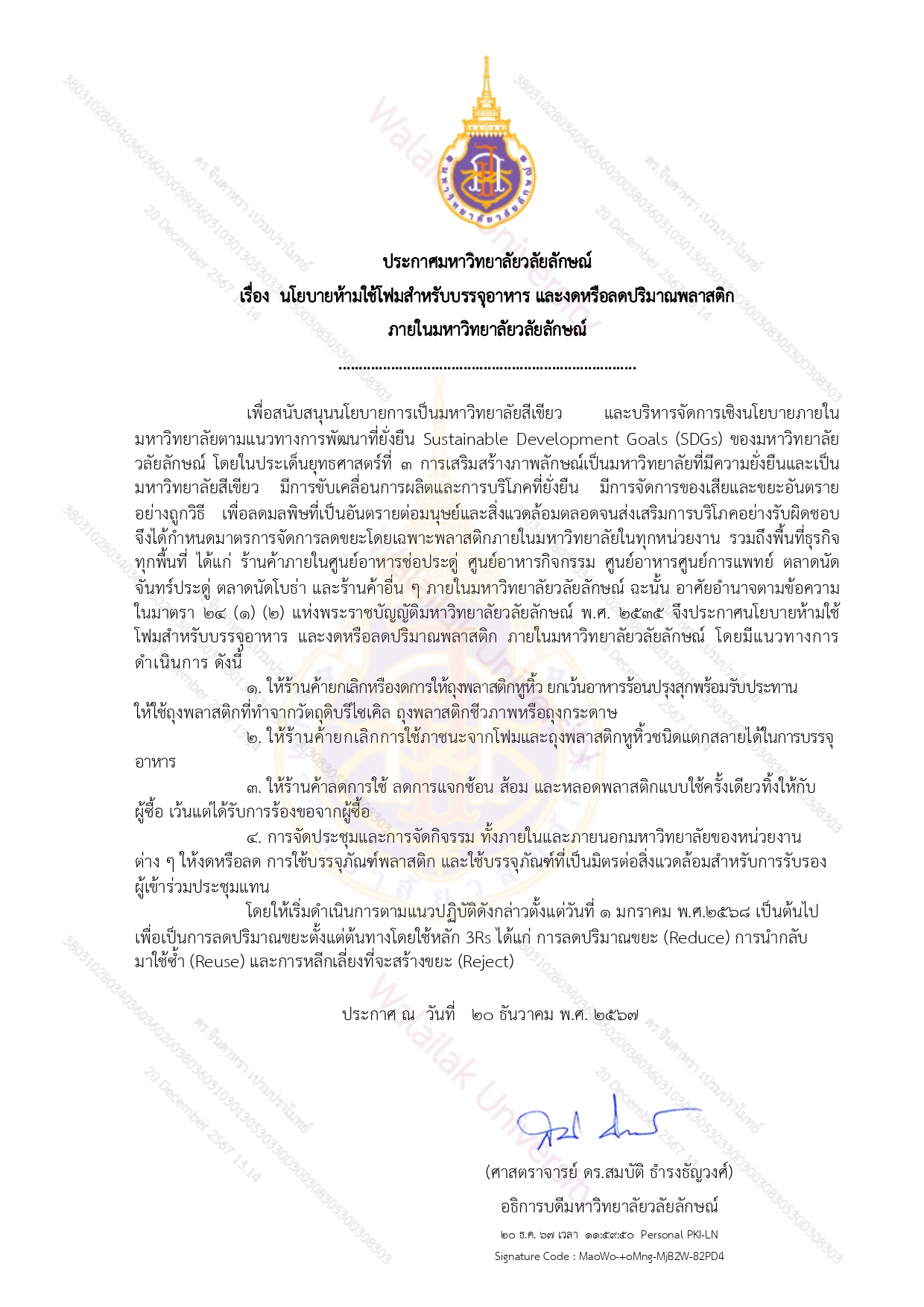 ตามที่ มหาวิทยาลัยวลัยลักษณ์ดำเนินการจัดทำประกาศมหาวิทยาลัยวลัยลักษณ์ เรื่องนโยบายห้ามใช้โฟมสำหรับบรรจุอาหารและงดหรือลดปริมาณพลาสติกภายในมหาวิทยาลัยวลัยลักษณ์ ซึ่งการดำเนินการตามแนวปฏิบัติดังกล่าวจะเริ่มตั้งแต่วันที่ 1 มกราคม 2568 เป็นต้นไป เพื่อเป็นการลดปริมาณขยะตั้งแต่ต้นทางโดยใช้หลัก 3Rs ได้แก่ การลดปริมาณขยะ (Reduce ) การนํากลับมาใช้ซํ้า (Reuse) และการหลีกเลี่ยงที่จะสร้างขยะ (Reject) และเป็นการขับเคลื่อนมหาวิทยาลัยสีเขียวและการพัฒนามหาวิทยาลัยตามแนวทางการพัฒนาที่ยั่งยืน Sustainable Development Goals (SDGs) ด้านการลดการใช้พลาสติกและการบริหารจัดการขยะ โดยการมีส่วนร่วมของทุกภาคส่วนที่เกี่ยวข้องในมหาวิทยาลัย