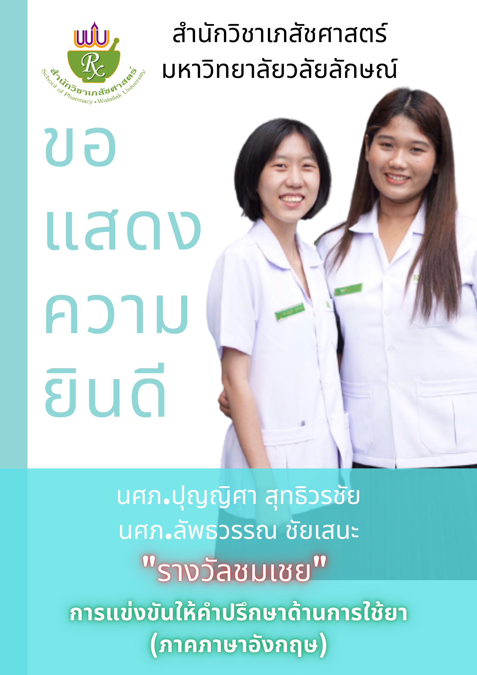 สหพันธ์นิสิตนักศึกษาเภสัชศาสตร์แห่งประเทศไทย หรือ สนภท. ได้จัดกิจกรรมการแข่งขันทักษะทางด้านเภสัชกรรม (Pharmacy event) ประจำปีการศึกษา 2563 โดยกิจกรรมจัดขึ้นเมื่อวันเสาร์ที่ 20 มีนาคม 2564 ที่ผ่านมา ในรูปแบบออนไลน์ผ่านทางโปรแกรม Google meet ในปีนี้ได้จัดการแข่งขันขึ้นทั้งหมด 2 การแข่งขัน ประกอบด้วย การแข่งขันให้คำปรึกษาด้านการใช้ยา (Patient counseling contest) ซึ่งแบ่งเป็นภาคภาษาไทยและภาคภาษาอังกฤษ และการแข่งขันตอบปัญหาทางเภสัชกรรม (Pharmacy quiz) โดยตัวแทนของสำนักวิชาเภสัชศาสตร์ มหาวิทยาลัยวลัยลักษณ์ คือ นศภ.ปุญญิศา สุทธิวรชัย และ นศภ.ลัพธวรรณ ชัยเสนะ สามารถคว้ารางวัลชมเชย ในการแข่งขันให้คำปรึกษาด้านการใช้ยา (ภาคภาษาอังกฤษ) สำนักวิชาเภสัชศาสตร์ มหาวิทยาลัยวลัยลักษณ์ ขอแสดงความชื่นชม และยินดีมา ณ โอกาสนี้