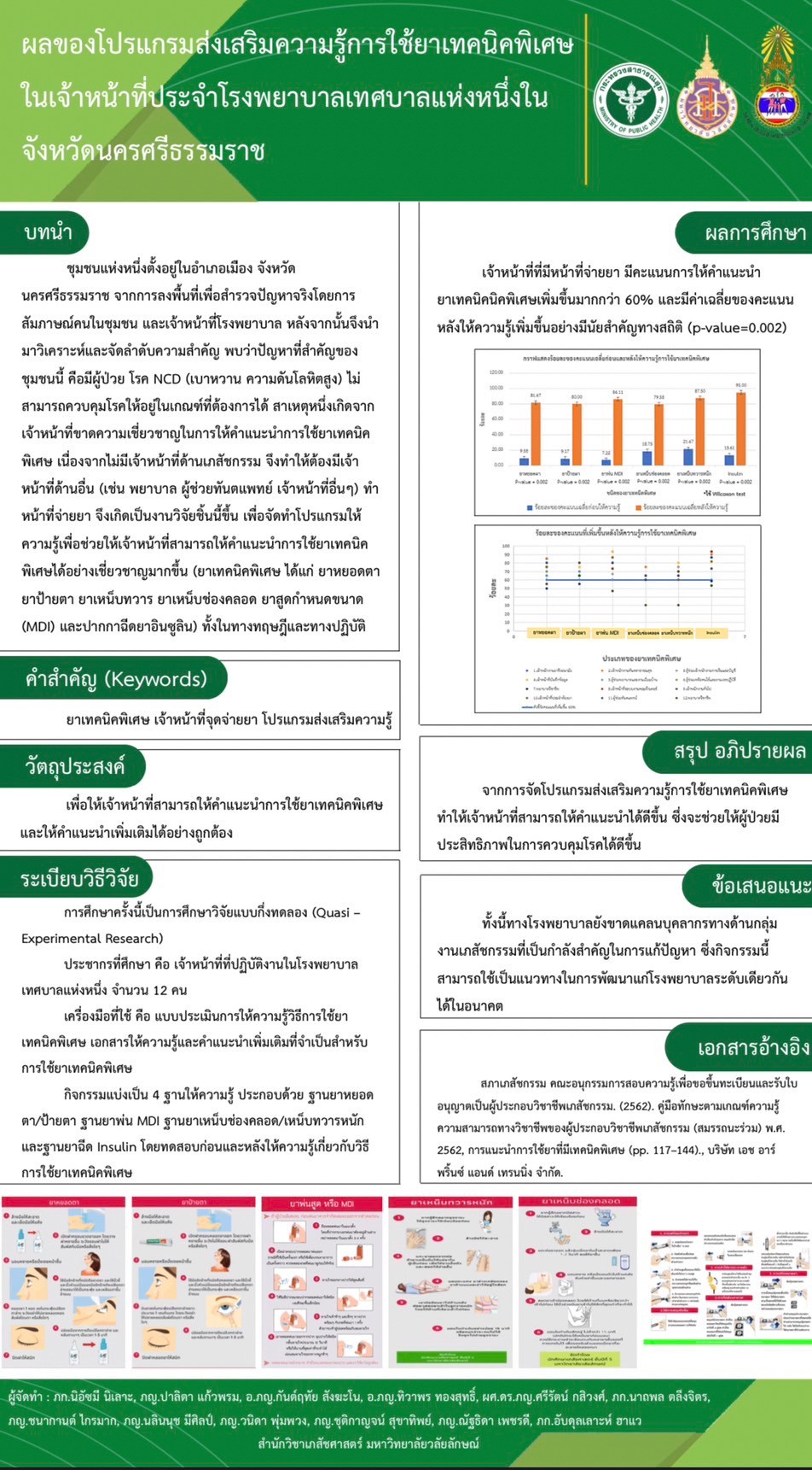 โดยนักศึกษาเภสัชศาสตร์ (ปัจจุบันสำเร็จการศึกษา และปฏิบัติหน้าที่เป็นเภสัชกร) นำเสนอผลงานประเภท Poster presentation ชื่อผลงาน ผลของโปรแกรมส่งเสริมความรู้การใช้ยาเทคนิคพิเศษในเจ้าหน้าที่ประจำโรงพยาบาลเทศบาลเมืองแห่งหนึ่งในจังหวัดนครศรีธรรมราช ผู้นำเสนอ ภก.นิอัซมี นิเลาะ โรงพยาบาลกาบัง จังหวัดยะลา , ภญ.ปาลิตา แก้วพรม โรงพยาบาลบางพลี จังหวัดสมุทรปราการ ศิษย์เก่ารุ่นที่ 9 และ อาจารย์ เภสัชกรหญิง กันต์ฤทัย สังฆะโน สำนักวิชาเภสัชศาสตร์ มหาวิทยาลัยวลัยลักษณ์