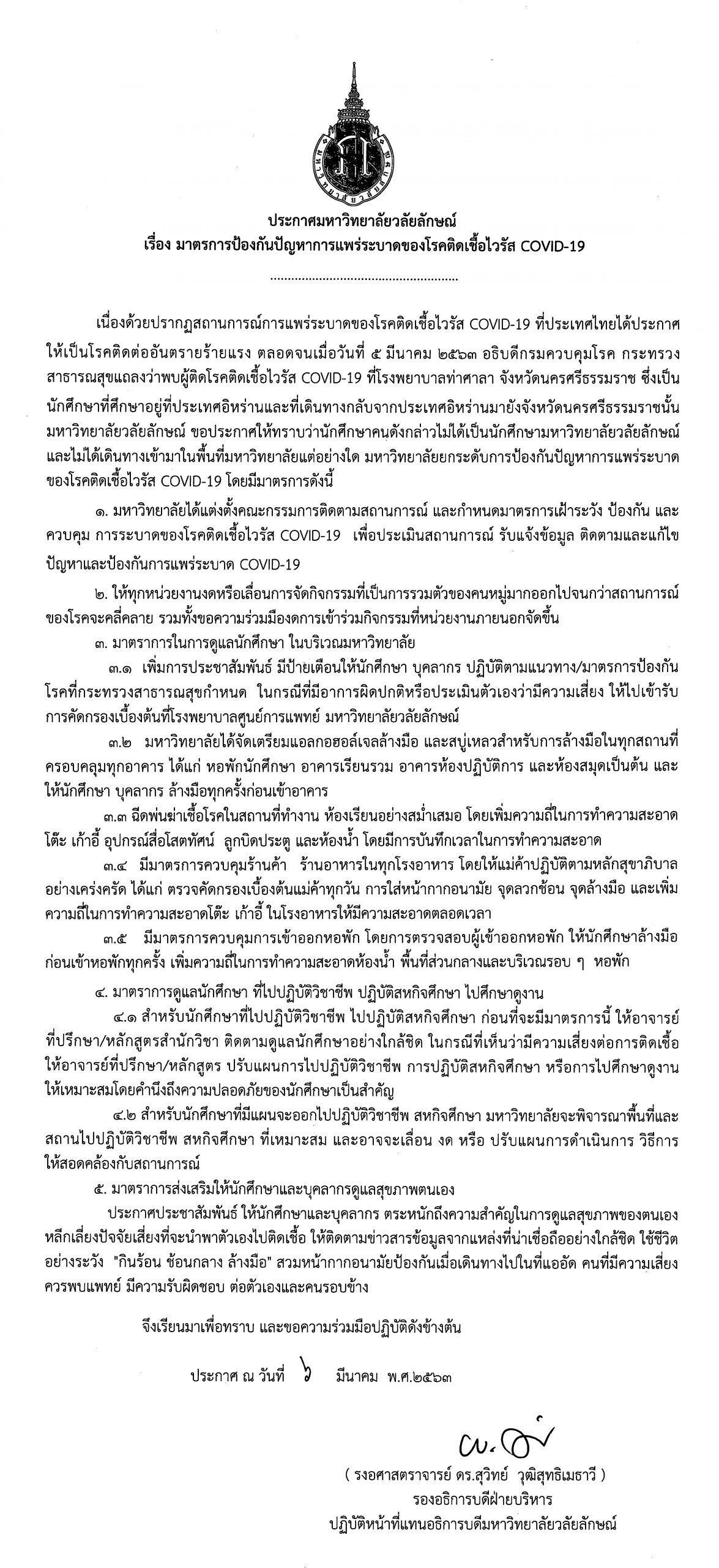 เนื่องด้วยปรากฏสถานการณ์การแพร่ระบาดของโรคติดเชื้อไวรัส COVID-19 ที่ประเทศไทยได้ประกาศ ให้เป็นโรคติดต่ออันตรายร้ายแรง ตลอดจนเมื่อวันที่ 5 มีนาคม 2563 อธิบดีกรมควบคุมโรค กระทรวงสาธารณสุขแถลงว่าพบผู้ติดโรคติดเชื้อไวรัส COVID-19 ที่โรงพยาบาลท่าศาลา จังหวัดนครศรีธรรมราช ซึ่งเป็นนักศึกษาที่ศึกษาอยู่ที่ประเทศอิหร่านและที่เดินทางกลับจากประเทศอิหร่านมายังจังหวัดนครศรีธรรมราชนั้น มหาวิทยาลัยวลัยลักษณ์ ขอประกาศให้ทราบว่านักศึกษาคนดังกล่าวไม่ได้เป็นนักศึกษามหาวิทยาลัยวลัยลักษณ์และไม่ได้เดินทางเข้ามาในพื้นที่มหาวิทยาลัยแต่อย่างใด มหาวิทยาลัยยกระดับการป้องกันปัญหาการแพร่ระบาดของโรคติดเชื้อไวรัส COVID-19 โดยมีมาตรการดังนี้