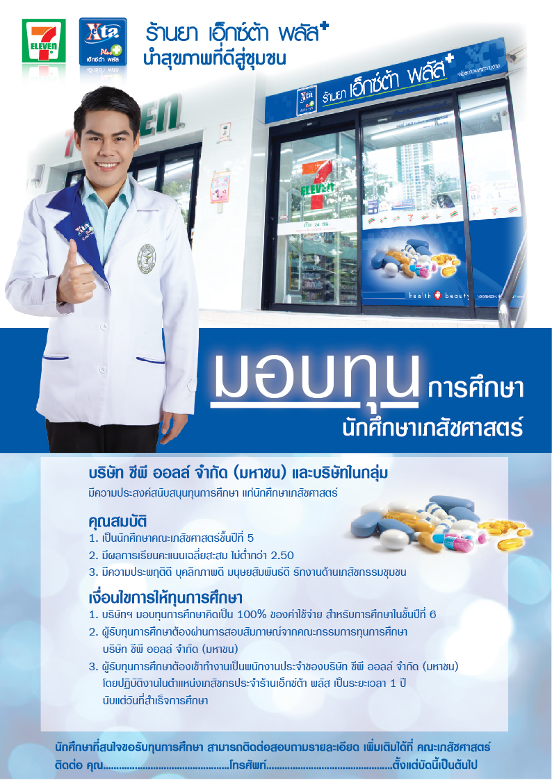จำนวนเงินทุนการศึกษา = 115,500 บาทต่อทุนการศึกษา (แบ่งจ่ายตามที่สำนักประสานรัฐกิจตกลงกับคณะฯ) หลังจบการศึกษา เข้าทำงานที่ร้านยา eXta เป็นเวลา 1 ปี