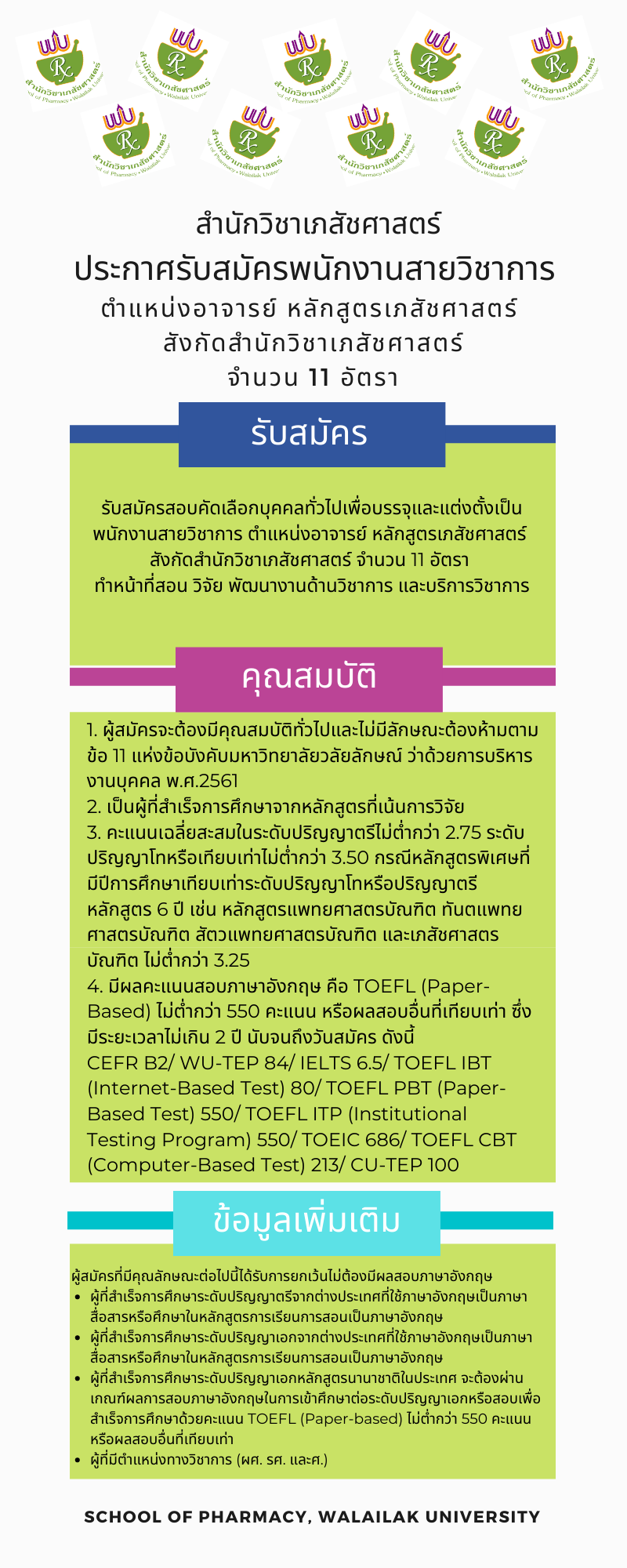 ด้วยมหาวิทยาลัยวลัยลักษณ์มีความประสงค์รับสมัครสอบคัดเลือกบุคคลทั่วไปเพื่อบรรจุและแต่งตั้งเป็นพนักงานสายวิชาการ ตำแหน่งอาจารย์ หลักสูตรเภสัชศาสตร์ สังกัดสำนักวิชาเภสัชศาสตร์ จำนวน 11 อัตรา ทำหน้าที่สอน วิจัย พัฒนางานด้านวิชาการ และบริการวิชาการ โดยมีรายละเอียดดังต่อไปนี้