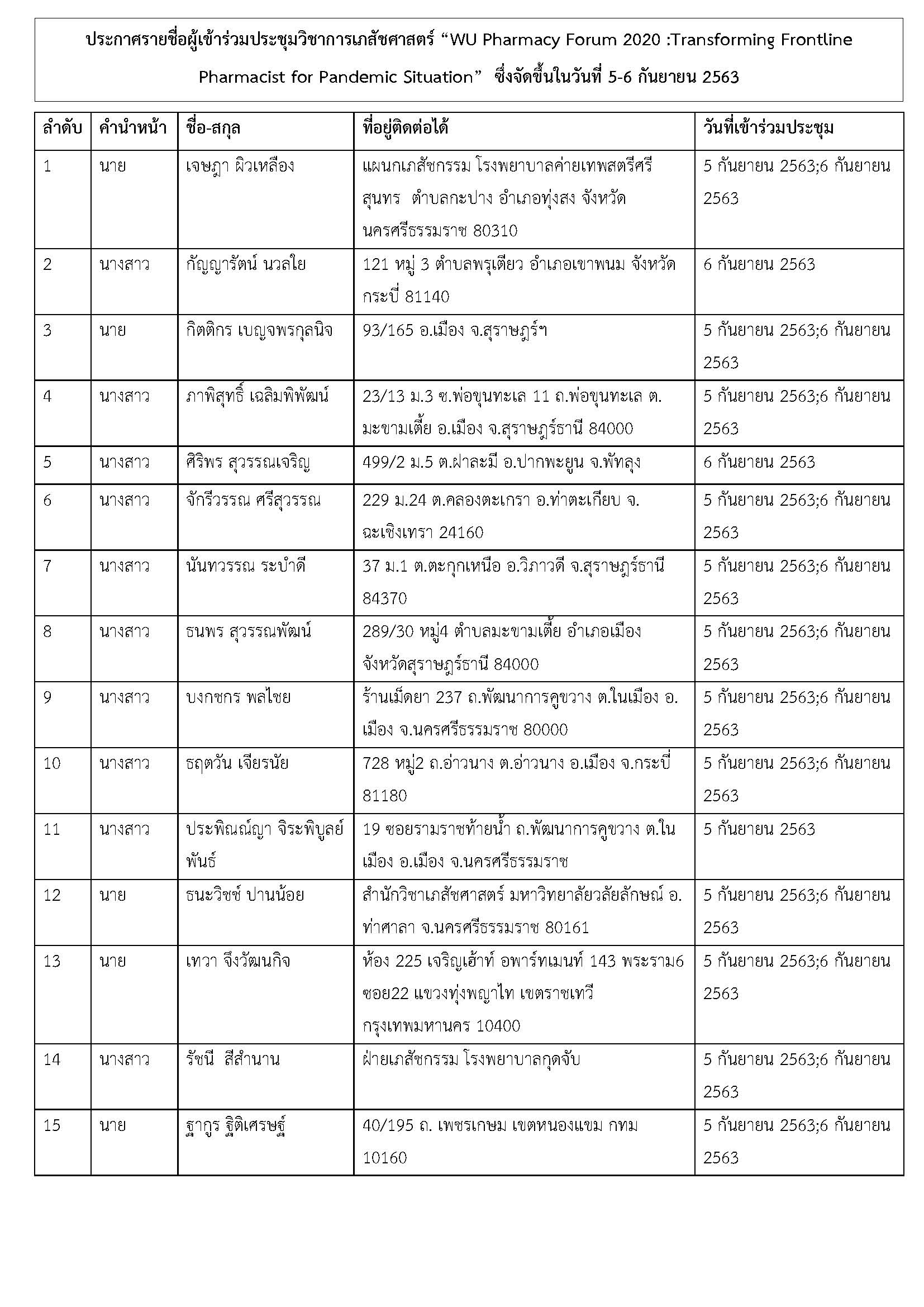 ประกาศรายชื่อผู้เข้าร่วมประชุมวิชาการเภสัชศาสตร์ “WU Pharmacy Forum 2020 :Transforming Frontline Pharmacist for Pandemic Situation” ซึ่งจัดขึ้นในวันที่ 5-6 กันยายน 2563 โดยจัดรูปแบบการประชุมออนไลน์ ผ่านระบบ Zoom Meeting
