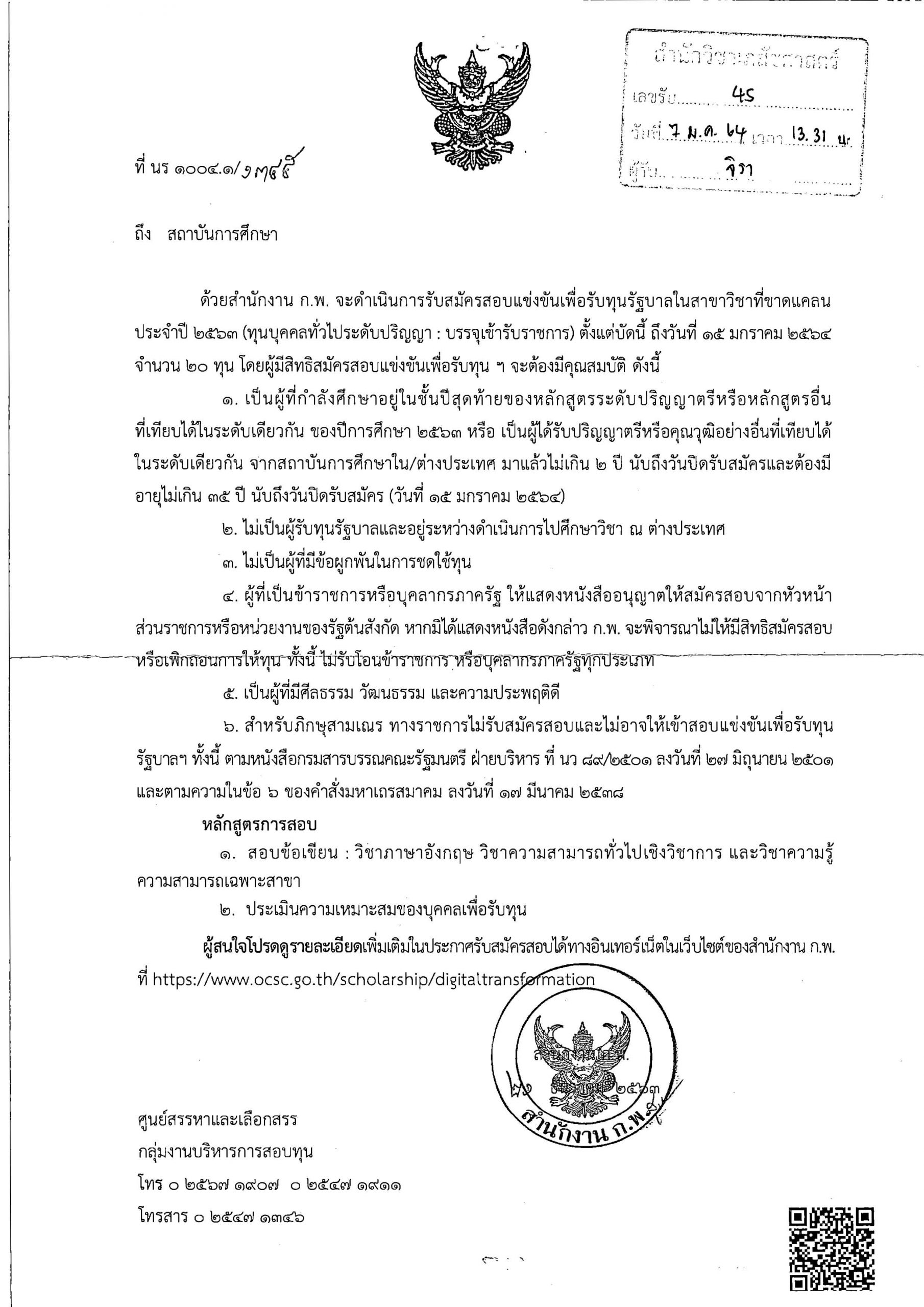 ผู้สนใจสามารถดูรายละเอียดเพิ่มเติมได้ในประกาศการรับสมัครได้ทางอินเตอร์ในเว็บไซต์ของสำนักงาน กพ. ที่ https://www.ocsc.go.th/scholarship/digitaltransformation