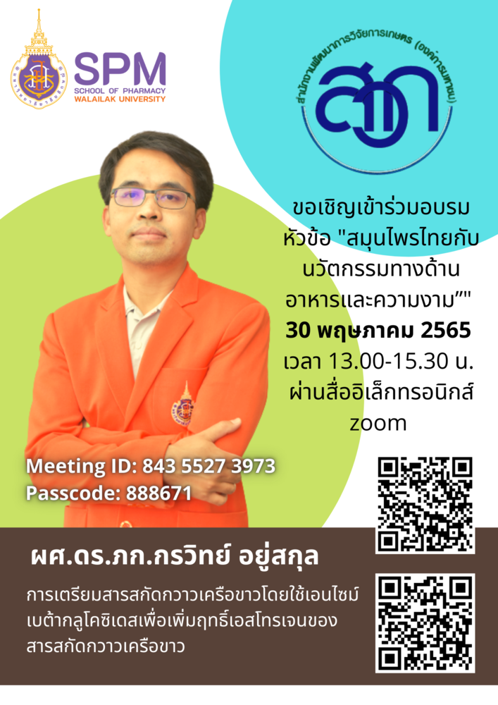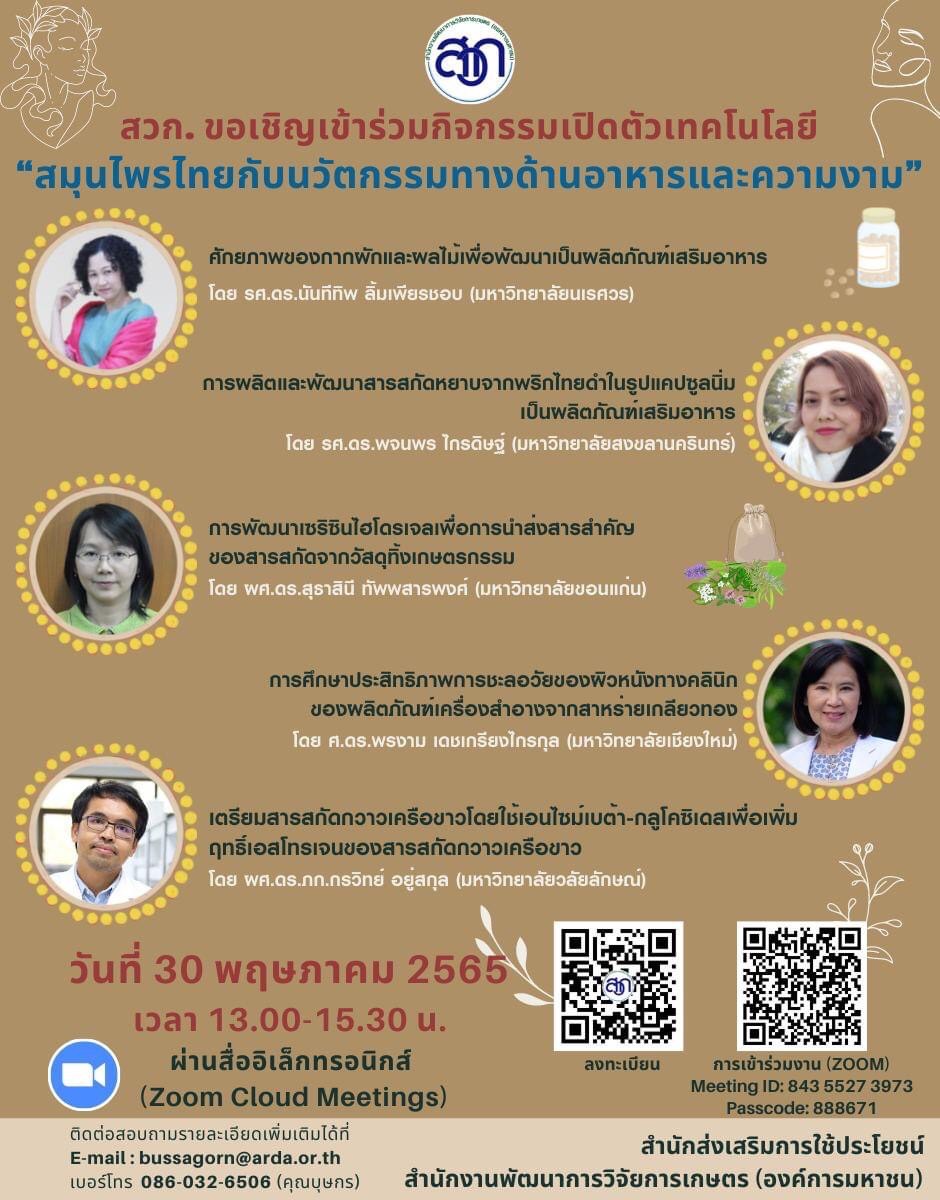 สำนักงานพัฒนาการวิจัยการเกษตร (องค์การมหาชน) – สวก ขอเชิญเข้าร่วมกิจกรรมเปิดตัวเทคโนโลยี “สมุนไพรไทยกับนวัตกรรมทางด้านอาหารและความงาม” 30 พฤษภาคม 2565 เวลา 13.00 – 15.30 น. ผ่านระบบ Zoom meeting ผู้สนใจสามารถลงทะเบียน และเข้าร่วมกิจกรรมตาม Zoom ID ดังปรากฎใน Flyer นี้ครับ