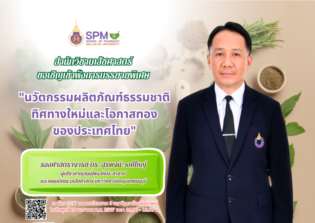 เนื่องด้วยรายวิชา PHA62-539 การวิจัยผลิตภัณฑ์ธรรมชาติ (Research in Natural Products) ได้เรียนเชิญ รองศาสตราจารย์ ดร. สุรพจน์ วงศ์ใหญ่ ผู้เชี่ยวชาญสมุนไพรสหประชาชาติและคณบดีคณะเภสัชศาสตร์ มหาวิทยาลัยกรุงเทพธนบุรี มาบรรยายพิเศษในหัวข้อ “นวัตกรรมผลิตภัณฑ์ธรรมชาติทิศทางใหม่และโอกาสทองของประเทศไทย” ในวันพุธที่ 10 มกราคม พ.ศ. 2567 เวลา 9.00 – 12.00 น. ณ ห้อง 3217 อาคารเรียนรวม 3 มหาวิทยาลัยวลัยลักษณ์ การนี้สำนักวิชาเภสัชศาสตร์ ขอเรียนเชิญ คณาจารย์, นักศึกษา และผู้สนใจเข้าฟังการบรรยายพิเศษดังกล่าว อนึ่งการบรรยายพิเศษนี้เป็นส่วนหนึ่งของการเรียนการสอน รายวิชา PHA62-539 การวิจัยผลิตภัณฑ์ธรรมชาติ (Research in Natural Products) ของนักศึกษาเภสัชศาสตร์ สาขาเภสัชกรรมอุตสาหการ สำนักวิชาเภสัชศาสตร์ มหาวิทยาลัยวลัยลักษณ์ (งดบริการอาหารว่าง และขอความร่วมมืองดนำอาหารมารับประทานในห้องบรรยาย)