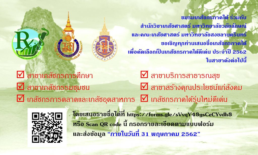 แบบฟอร์มเสนอชื่อเพื่อคัดเลือกเภสัชกรภาคใต้ดีเด่น ประจำปี 2562