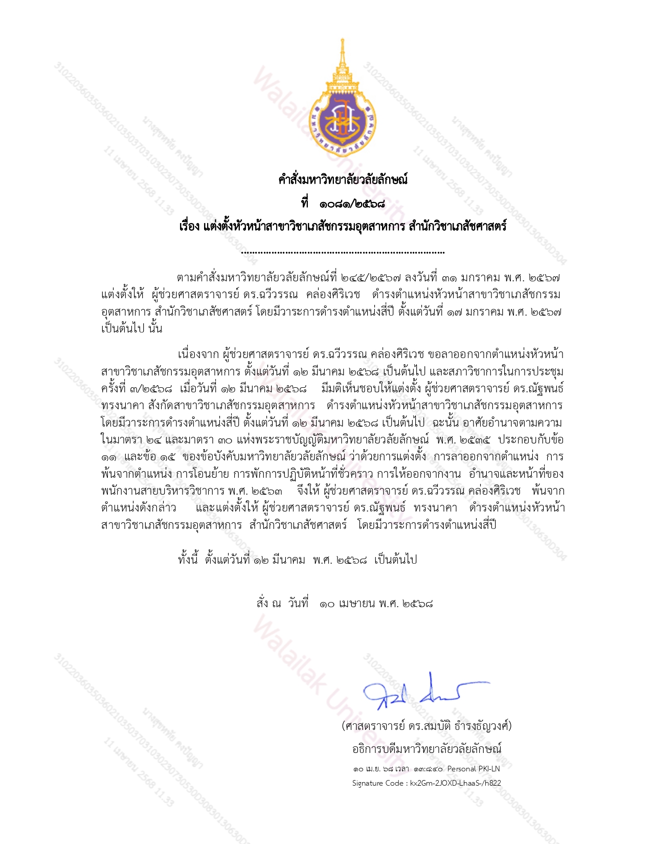 ด้วยมหาวิทยาลัยวลัยลักษณ์ได้มีคำสั่งที่ 1081/2568 ลงวันที่ 10 เมษายน พ.ศ.2568 แต่งตั้งให้ ผู้ช่วยศาสตราจารย์ ดร. เภสัชกร ณัฐพนธ์ ทรงนาคา ดำรงตำแหน่งหัวหน้าสาขาวิชาเภสัชกรรมอุตสาหการ สำนักวิชาเภสัชศาสตร์ มหาวิทยาลัยวลัยลักษณ์ มีวาระการดำรงตำแหน่งสี่ปี ตั้งแต่วันที่ 12 มีนาคม 2568 เป็นต้นไป