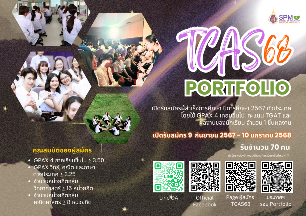 มหาวิทยาลัยวลัยลักษณ์มีนโยบายรับสมัครนักเรียนที่กำลังศึกษาอยู่ในระดับชั้นมัธยมศึกษาปีที่ ๖ หรือเทียบเท่าของโรงเรียนซึ่งตั้งอยู่ทุกภูมิภาคของประเทศไทยและในต่างประเทศ เพื่อเข้าศึกษาในระดับปริญญาตรี สำนักวิชาเภสัชศาสตร์ รอบที่ ๑ Portfolio ประจำปีการศึกษา ๒๕๖๘ โดยใช้คะแนนเฉลี่ยสะสม (GPAX) คะแนนสอบ TGAT และแฟ้มผลงานของนักเรียน (Portfolio) ทั้งนี้ มหาวิทยาลัยมีนโยบายการให้โอกาสทางการศึกษา มีความเสมอภาคทางเพศในการรับเข้าศึกษา มีสิ่งสนับสนุนการเรียนการสอนที่เหมาะสมกับทุกเพศสภาพ รวมทั้งส่งเสริมความเข้มแข็งให้กับเพศหญิงได้มีโอกาสเรียนรู้และพัฒนาเท่าเทียมกับเพศสภาพอื่น โดยมีรายละเอียด ดังนี้