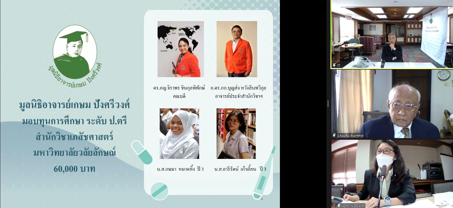 โดยได้รับทุนการศึกษาฯ เป็นจำนวนเงิน 30,000 บาท ต่อทุน เป็นจำนวน 2 ทุน เป็นเงินทั้งสิ้น 60,000 บาท โดยทางมูลนิธิอาจารย์เกษม ปังศรีวงศ์ จะดำเนินการโอนเงินทุนดังกล่าวให้กับนักศึกษาเภสัชศาสตร์ที่ได้รับทุนต่อไป