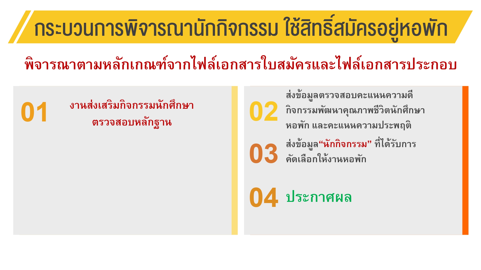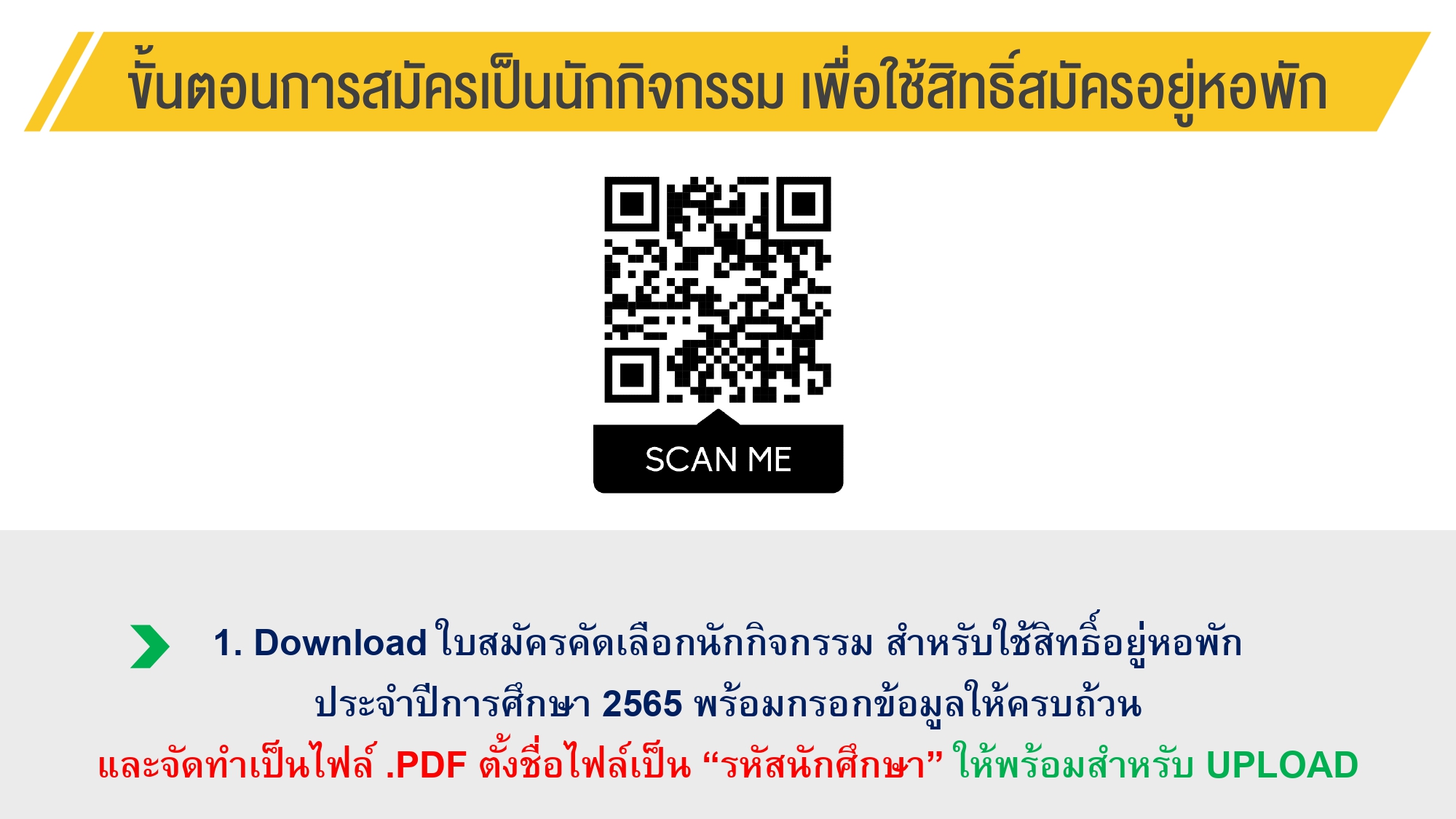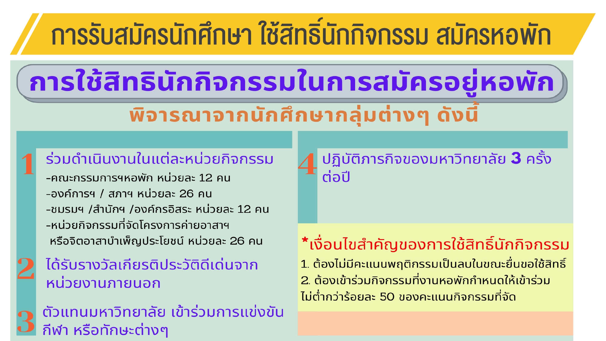 ด้วยงานส่งเสริมกิจกรรมนักศึกษา ส่วนกิจการนักศึกษา กำหนดรับสมัครนักศึกษาเพื่อพิจารณาคัดเลือกเป็น “นักกิจกรรม” สำหรับใช้สิทธิ์สมัครอยู่หอพัก ประจำปีการศึกษา 2565 โดยให้นักศึกษาสมัครออนไลน์เป็นรายบุคคล ผ่านระบบ google form ตั้งแต่บัดนี้จนถึงวันที่ 25 กุมภาพันธ์ 2565 นั้น