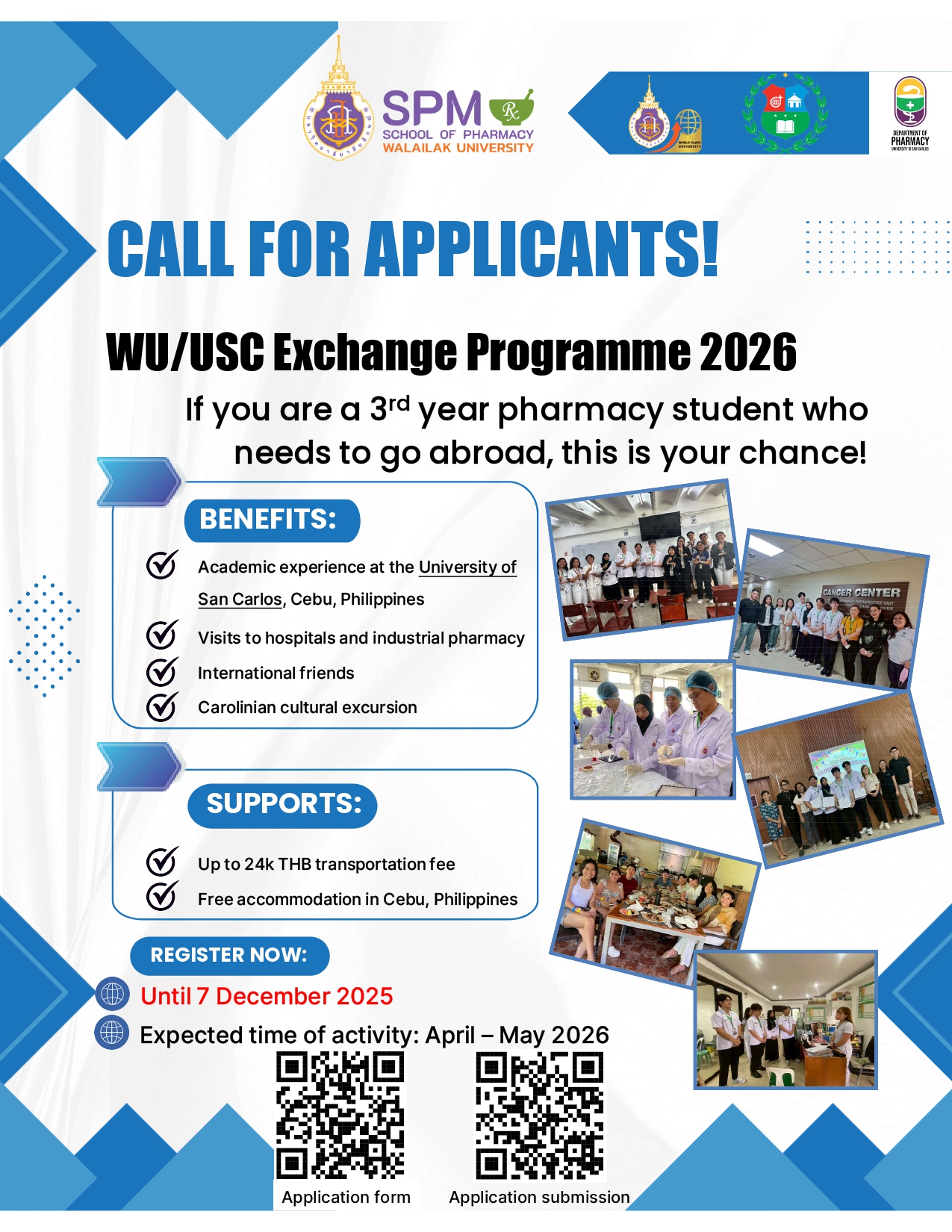 นครศรีธรรมราช — สำนักวิชาเภสัชศาสตร์ มหาวิทยาลัยวลัยลักษณ์ เปิดรับสมัครนักศึกษาเข้าร่วมโครงการ WU/USC Pharmacy Exchange Programme 2026 ซึ่งเป็นโอกาสพิเศษสำหรับนักศึกษาที่มีศักยภาพจำนวน 4 คน เพื่อเข้าร่วมโครงการแลกเปลี่ยนประสบการณ์ทางวิชาการ ณ University of San Carlos (USC) ประเทศฟิลิปปินส์