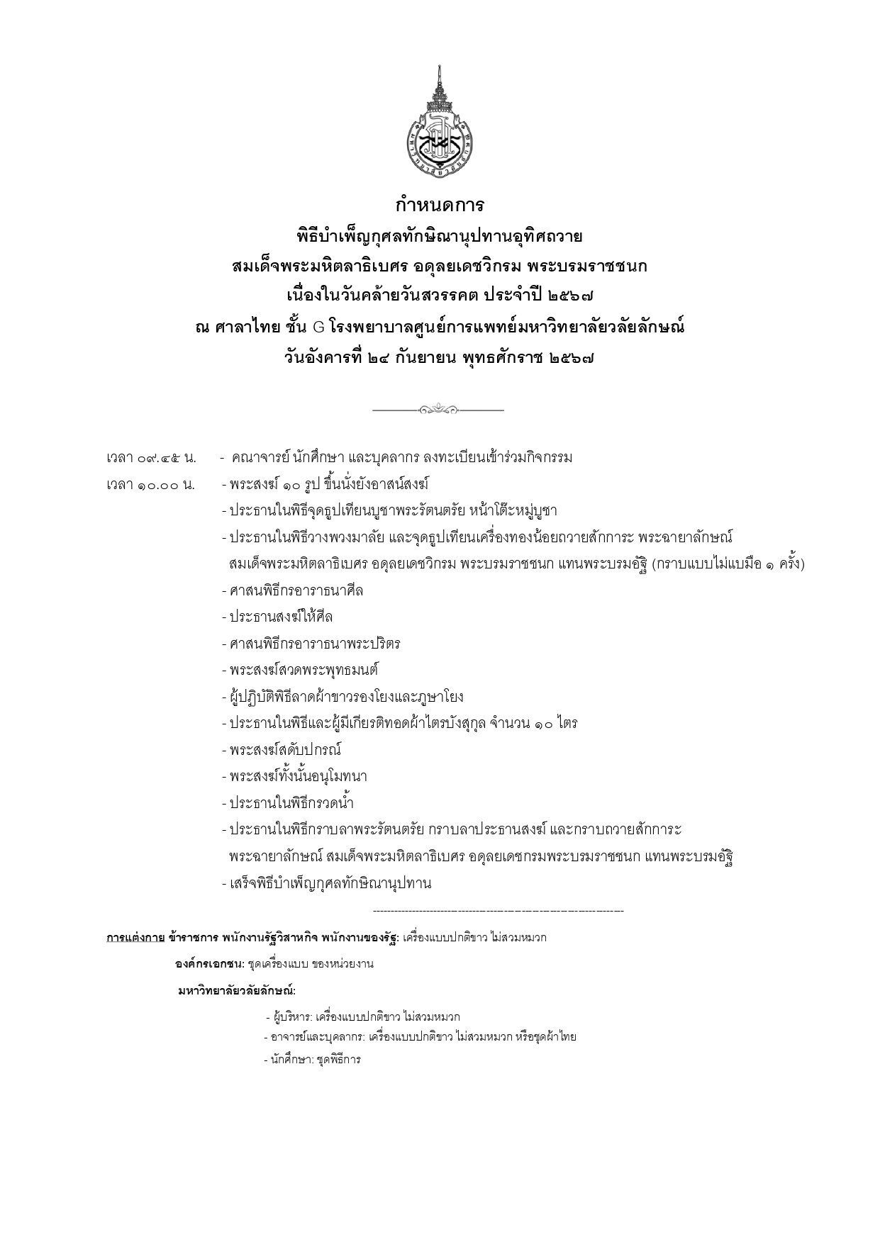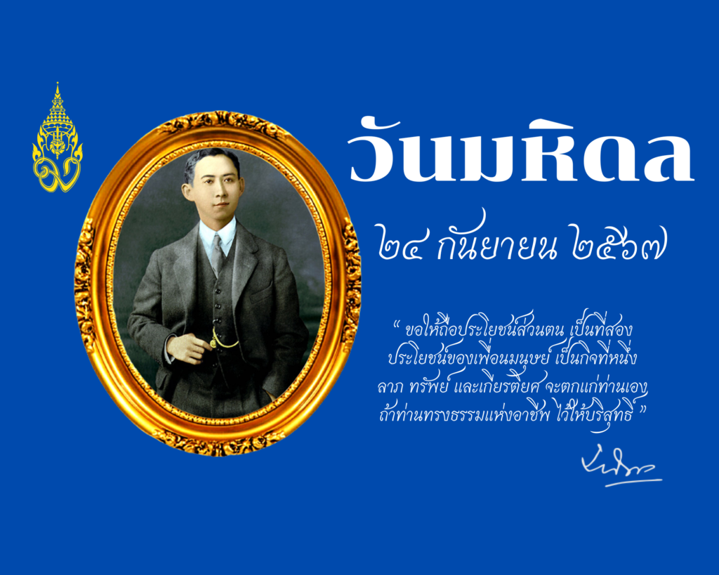 ตามที่วิทยาลัยทันตแพทยศาสตร์นานาชาติ ได้เป็นเจ้าภาพในการรจัดพิธีบำเพ็ญกุศลทักษิณานุปทานถวายสักการะ สมเด็จพระมหิตลาธิเบศร อดุลยเดชวิกรม พระบรมราชชนก เนื่องในวันมหิดลประจำปี ๒๕๖๗ ในวันอังคารที่ 24 กันยายน พ.ศ. 2567 ตั้งแต่เวลา ๐๙.๔๕ น. เป็นต้นไป ตามกำหนดการดังแนบ จึงขอเรียนเชิญ คณาจารย์ นักศึกษา บุคคลากร เข้าร่วมกิจกรรมดังกล่าว โดยพร้อมเพรียงกัน ณ ศาลาไทย ชั้น G โรงพยาบาลศูนย์การแพทย์ มหาวิทยาลัยวลัยลักษณ์