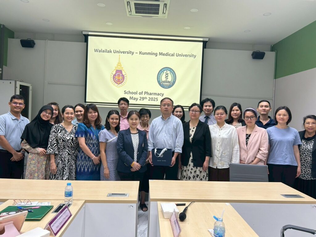 เมื่อวันที่ 29 พฤษภาคม พ.ศ. 2568 สำนักวิชาเภสัชศาสตร์ มหาวิทยาลัยวลัยลักษณ์ ได้มีโอกาสต้อนรับคณบดีและคณะอาจารย์จาก School of Pharmaceutical Science, Kunming Medical University มณฑลยูนนาน สาธารณรัฐประชาชนจีน โดยคณะผู้บริหารของทั้งสองสถาบันได้หารือร่วมกันถึงความเป็นไปได้ที่จะพัฒนาโครงร่างงานวิจัยที่อาจารย์จาก Kunming Medical University ทำร่วมกับคณาจารย์จากมหาวิทยาลัยวลัยลักษณ์ นอกจากนั้น ยังได้หารือร่วมกันถึงความเป็นไปได้ที่จะพัฒนาโครงการแลกเปลี่ยนระยะสั้นและการฝึกปฏิบัติงานวิชาชีพเภสัชกรรมของนักศึกษาเภสัชศาสตร์ในระดับปริญญาตรี ต่อจากนั้นได้พาคณะอาจารย์จาก Kunming Medical University ไปเยี่ยมชมมหาวิทยาลัยวลัยลักษณ์ โดยก่อนกลับ ทางทีมคณะจาก Kunming Medical University ได้กล่าวขอบคุณและเรียนเชิญทางสำนักวิชาเภสัชศาสตร์ให้ไปเยี่ยมชมสถานที่จริงที่ Kunming Medical University เพื่อเพิ่มความเข้าใจในบริบทของสถานที่อันจะนำไปสู่ความร่วมมือในด้านอื่นๆ ต่อไป