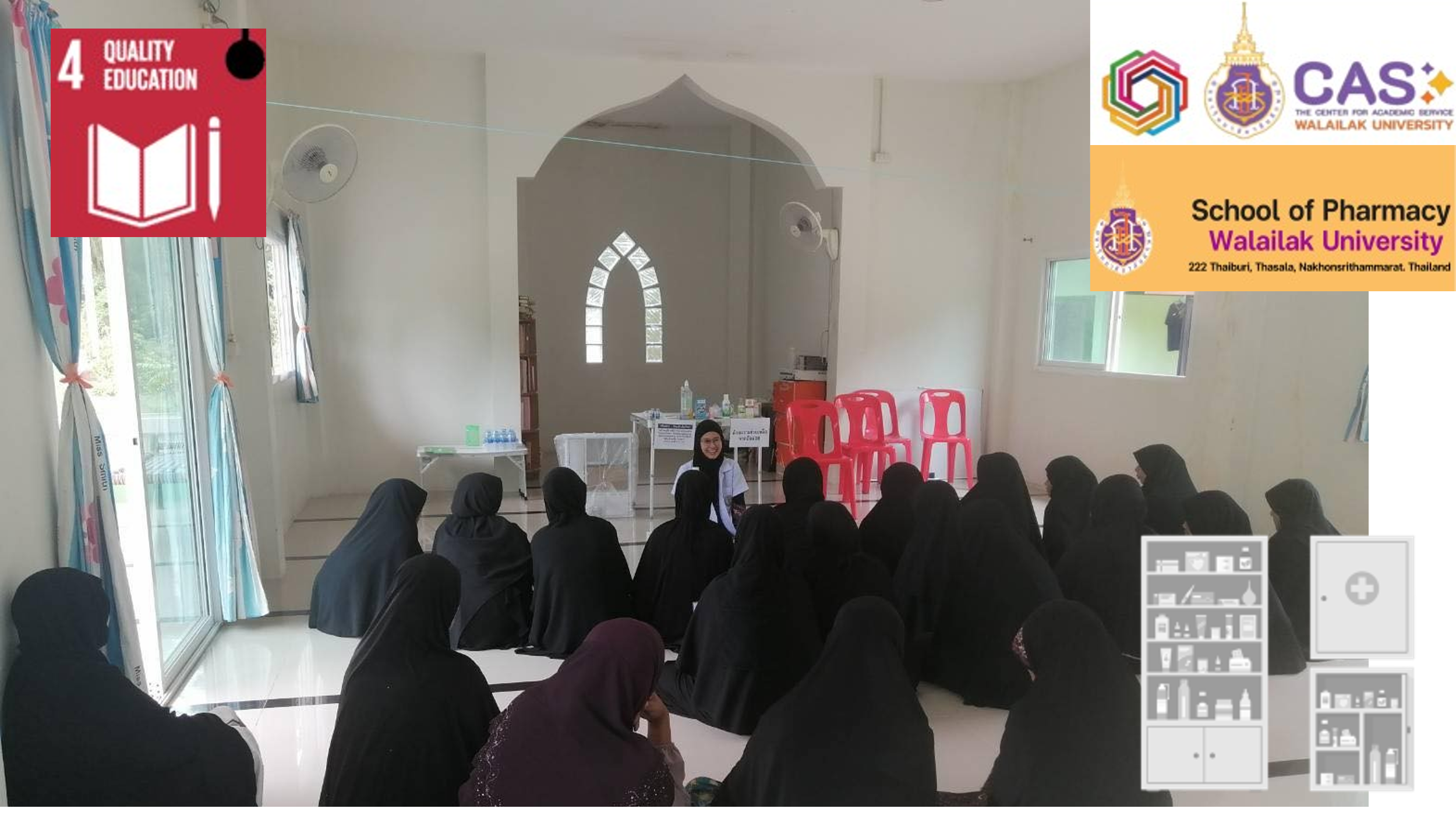 สำนักวิชาเภสัชศาสตร์ มหาวิทยาลัยวลัยลักษณ์ ดำเนินโครงการวิชาการรับใช้สังคม (WU - Social engagement) ต่อเนื่องในพื้นที่ชุมชนบ้านสระบัว มีจุดมุ่งหมายเพื่อส่งเสริมสุขภาวะและความเป็นอยู่ที่ดีของคนในชุมชน (Good health and Well-being) ผ่านการศึกษาที่มีคุณภาพ (Quality Education) โดยได้ตอบโจทย์ความต้องการของชุมชนในการส่งเสริมและกระจายความรู้แก่เยาวชนที่เรียนในโรงเรียนนอกระบบ (Non-formal education)