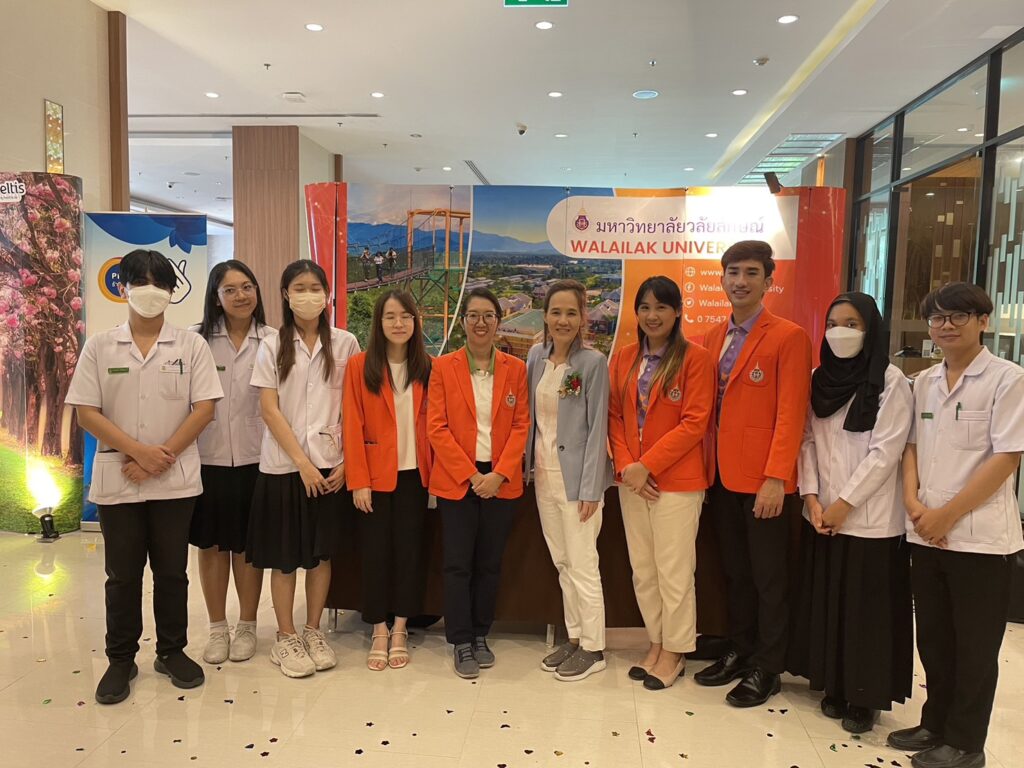 เมื่อวันอาทิตย์ที่ 8 ตุลาคม พ.ศ. 2566 สำนักวิชาเภสัชศาสตร์ มหาวิทยาลัยวลัยลักษณ์ นำทีมโดย อาจารย์ เภสัชกรหญิง ดร. บุษบรรณ สุขกาญจน์, ผศ.เภสัชกรหญิง กันต์ฤทัย สังฆะโน, อาจารย์ เภสัชกร ธีรภัทร์ มาแจ่ม, อาจารย์ เภสัชกรหญิง ดร. ณิชกานต์ อภิรมย์รักษ์, เภสัชกรหญิง วัณณ์สุภางค์ ช่วยพนัง และนักศึกษาเภสัชศาสตร์ชั้นปี 5 จำนวน 5 คน ประกอบด้วย นศภ.ปิ่นมุก สิทธิชัย นศภ.อภิสรา อินทโน นศภ.อามาลีนา ชุมรักษา นศภ.ปัญญากร อุทกโยธะ และ นศภ.สุรพาส สิทธิวรกาญจน์ เข้าร่วมงานประชุมสมัชชาใหญ่ ชมรมร้านขายยาจังหวัดนครศรีธรรมราช ณ โรงแรมแกรนด์ฟอร์จูน โดยในงานนี้สำนักวิชาเภสัชศาสตร์ มหาวิทยาลัยวลัยลักษณ์ ได้ออกบู้ทประชาสัมพันธ์สำนักวิชาเภสัชศาสตร์ และตัวแทนคณาจารย์ได้พูดประชาสัมพันธ์บนเวทีเพื่อเชิญชวนเภสัชกรทุกท่านร่วมเป็นส่วนหนึ่งในการสร้างเภสัชกรที่มีคุณภาพให้แก่วิชาชีพ โดยมีประเด็นครอบคลุม 3 ประเด็นด้วยกันคือ 1) ประชาสัมพันธ์รับเป็นแหล่งฝึกปฏิบัติงานวิชาชีพเภสัชกรรม (ร้านยา) 2) ประชาสัมพันธ์รับสมัครเป็นอาจารย์เภสัชกร และ 3) ประชาสัมพันธ์อาศรมยาวลัยลักษณ์ ซึ่งเป็นสถานปฏิบัติการทางเภสัชกรรมของสำนักวิชาเภสัชศาสตร์ มหาวิทยาลัยวลัยลักษณ์ โดยเป็นที่ปรึกษาพัฒนาร้านยาสู่ร้านยาคุณภาพ สำหรับในบู้ท มีให้แสกน QR code ตอบแบบสำรวจความพร้อมในการรับเป็นแหล่งฝึกปฎิบัติงานวิชาชีพเภสัชกรรมสำหรับนักศึกษาเภสัชศาสตร์ และหมุนวงล้อลุ้นรับของรางวัลจากทางมหาวิทยาลัยฯ ซึ่งมีเภสัชกรร้านยาให้ความสนใจ และเข้าร่วมกิจกรรมเป็นจำนวนมาก