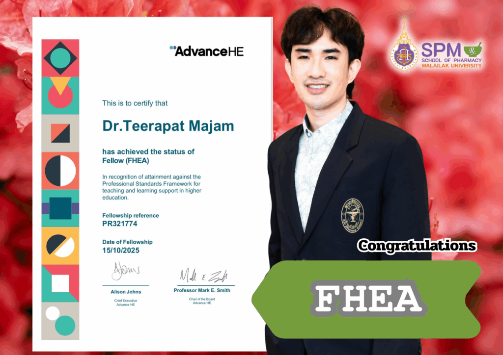 นครศรีธรรมราช – สำนักวิชาเภสัชศาสตร์ มหาวิทยาลัยวลัยลักษณ์ ขอแสดงความยินดีกับ อาจารย์ธีรภัทร์ มาแจ่ม อาจารย์ประจำสำนักวิชาเภสัชศาสตร์ ที่ได้รับการรับรองในระดับ Fellow ซึ่งเป็นเกียรติยศแสดงถึงความเชี่ยวชาญและความเป็นผู้นำทางวิชาชีพในระดับสูง ในมาตรฐานความรู้ The UK Professional Standards Framework (UKPSF) การได้รับการรับรองในระดับ Fellow ถือเป็นการยอมรับถึงคุณสมบัติ ความรู้ ความสามารถ และผลงานที่โดดเด่นของอาจารย์ธีรภัทร์ ทั้งในด้านการสอน การวิจัย และการพัฒนานวัตกรรมทางเภสัชศาสตร์ ที่สร้างคุณประโยชน์แก่สังคมและประเทศชาติ ทั้งนี้สำนักวิชาเภสัชศาสตร์ มหาวิทยาลัยวลัยลักษณ์ ขอแสดงความภาคภูมิใจในความสำเร็จครั้งนี้ และขออวยพรให้อาจารย์ธีรภัทร์ประสบความสำเร็จยิ่งขึ้นในเส้นทางวิชาชีพและการพัฒนางานด้านเภสัชศาสตร์ต่อไป
