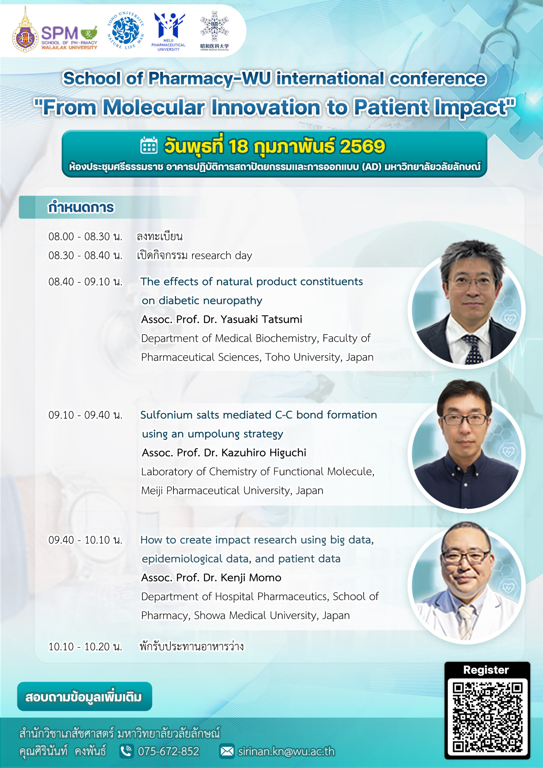 สำนักวิชาเภสัชศาสตร์ มหาวิทยาลัยวลัยลักษณ์ (WU) ขอเชิญชวนคณาจารย์ นักวิจัย นักศึกษา และผู้ที่สนใจเข้าร่วมงานประชุมวิชาการนานาชาติและกิจกรรม Research Day ภายใต้หัวข้อ “From Molecular Innovation to Patient Impact” ในวันพุธที่ 18 กุมภาพันธ์ 2569 ณ ห้องประชุมศรีธรรมราช อาคารปฏิบัติการสถาปัตยกรรมและการออกแบบ (AD) มหาวิทยาลัยวลัยลักษณ์