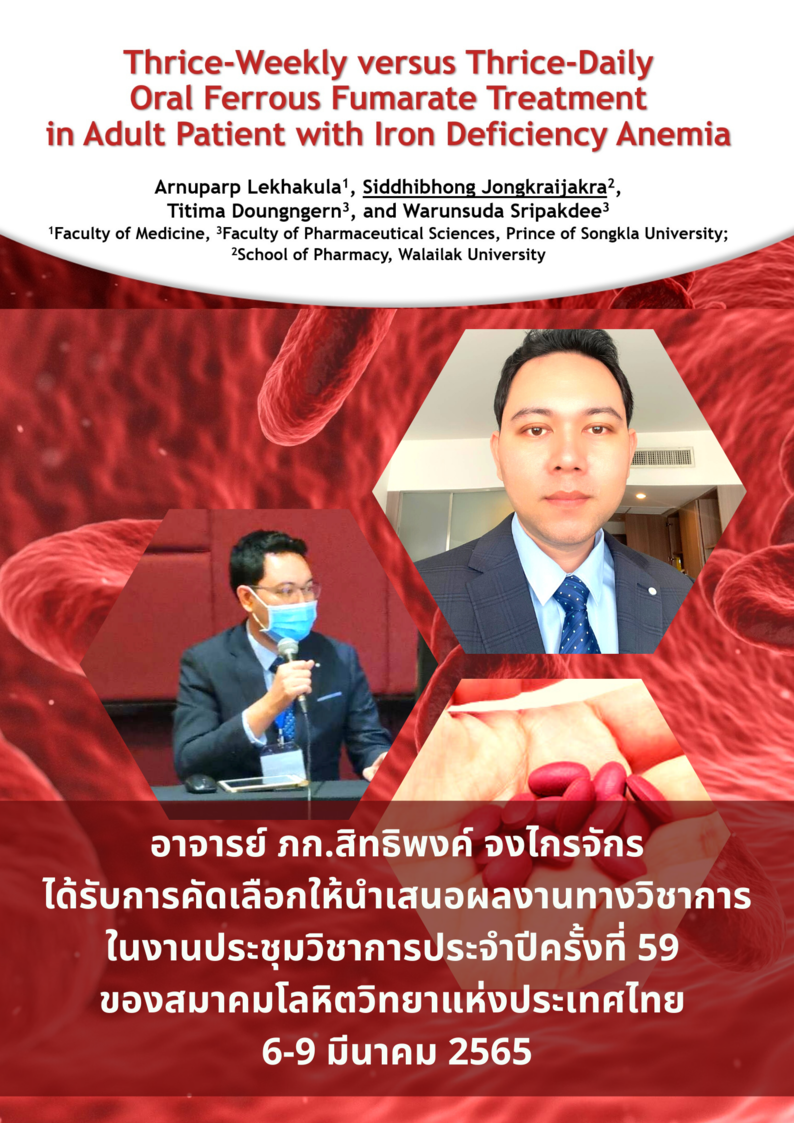 อาจารย์ เภสัชกร สิทธิพงค์ จงไกรจักร อาจารย์สาขาการบริบาลทางเภสัชกรรม ได้รับการคัดเลือกให้นําเสนอผลงานวิจัยเรื่อง “Thrice-weekly versus thrice-daily oral ferrous fumarate treatment in adult patients with iron deficiency anemia” รูปแบบ Oral Presentation ในงานประชุมวิชาการประจําปีครั้งที่ 59 ของสมาคมโลหิตวิทยาแห่งประเทศไทย ซึ่งจัดขึ้นระหว่างวันที่ 6-9 มีนาคม 2565 ณ โรงแรมเซ็นทาราแกรนด์ เซ็นทรัลเวิลด์ กรุงเทพมหานคร