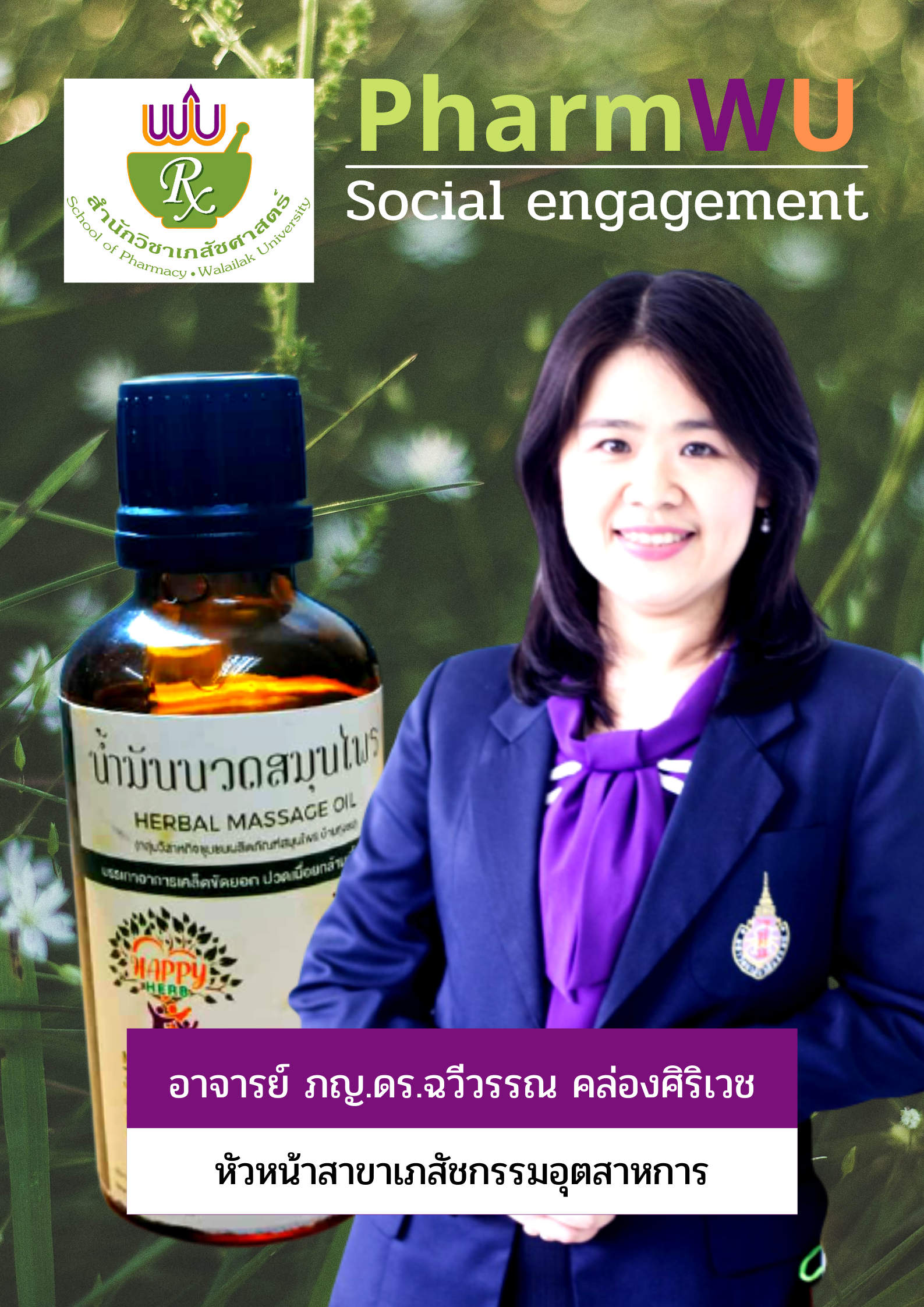 วันศุกร์ที่ 10 กันยายน 2564 อาจารย์ เภสัชกรหญิง ดร.ฉวีวรรณ คล่องศิริเวช หัวหน้าสาขาเภสัชกรรมอุตสาหการ สำนักวิชาเภสัชศาสตร์ มหาวิทยาลัยวลัยลักษณ์ เป็นวิทยากรบรรยายถ่ายทอดความรู้เกี่ยวกับสมุนไพร และการเตรียมตำรับยาจากสมุนไพร คือ น้ำมันนวดสมุนไพร หรือ Herbal Massage Oil โดยดำเนินการร่วมกับศูนย์บริการวิชาการ มหาวิทยาลัยวลัยลักษณ์ ณ โรงพยาบาลส่งเสริมสุขภาพตำบลบ้านทุ่งชน อำเภอท่าศาลา จังหวัดนครศรีธรรมราช ซึ่งนอกจากผู้เข้าร่วมกิจกรรมจะได้ความรู้เกี่ยวกับสมุนไพร และการเตรียมตำรับยาจากสมุนไพรแล้ว ยังได้รับผลิตภัณฑ์น้ำมันนวดสมุนไพรไปใช้อีกด้วย ซึ่งกิจกรรมนี้เป็นกิจกรรมหนึ่งในกิจกรรม Social engagement ของสำนักวิชาเภสัชศาสตร์ มหาวิทยาลัยวลัยลักษณ์