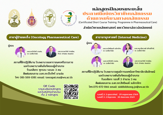 สำนักวิชาเภสัชศาสตร์ มหาวิทยาลัยวลัยลักษณ์ เปิดรับสมัครเภสัชกรเข้าอบรม “หลักสูตรฝึกอบรมระยะสั้น ประกาศนียบัตรวิชาชีพเภสัชกรรม ด้านการบริบาลทางเภสัชกรรม (Certified Short Course Training Programme in Pharmaceutical Care)” ประจำปี 2569 ครอบคลุม 2 สาขา ได้แก่