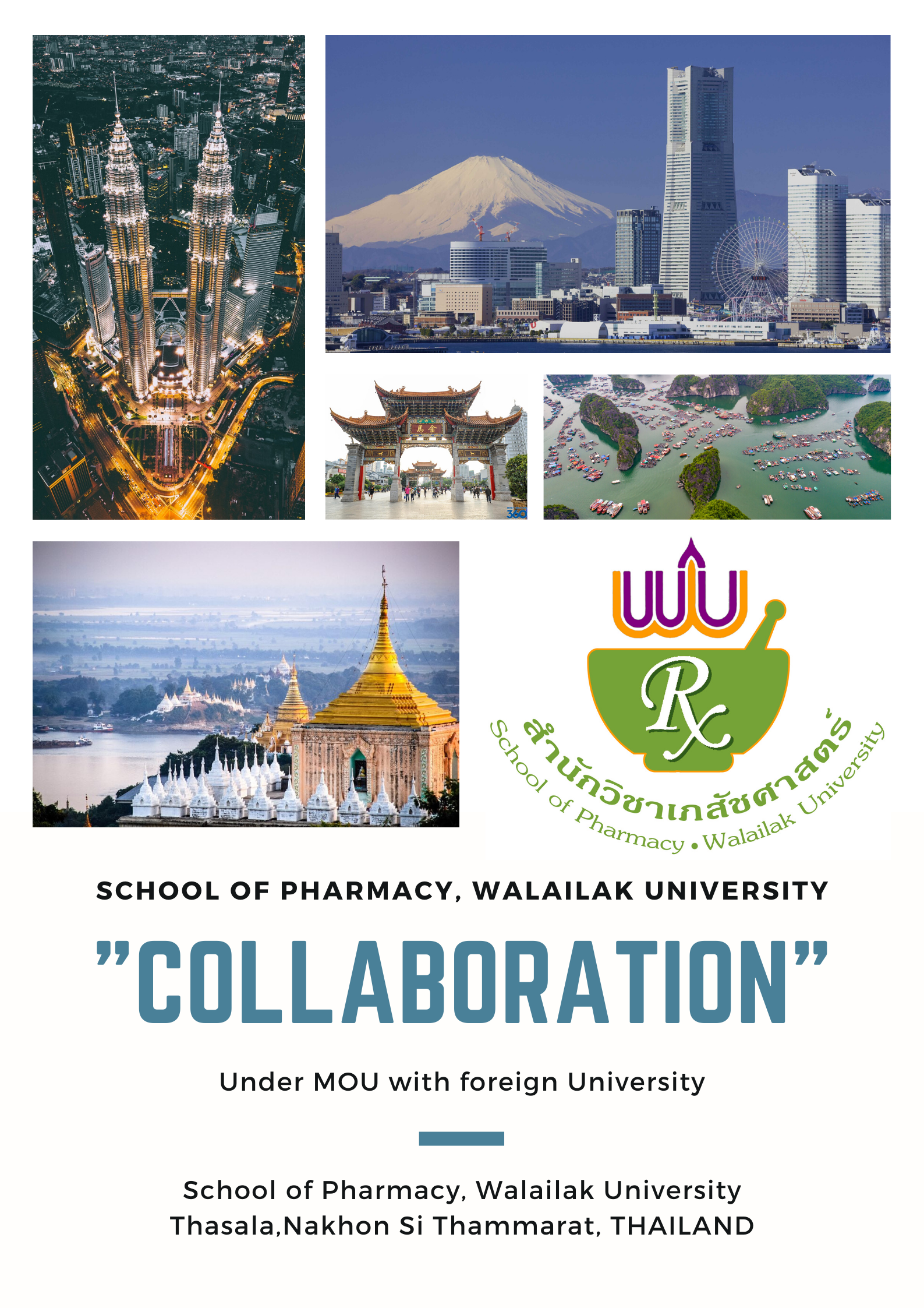 สำนักวิชาเภสัชศาสตร์ มหาวิทยาลัยวลัยลักษณ์ มุ่งเน้นพัฒนาระบบการศึกษาด้านเภสัชศาสตร์ เพื่อผลิตบัณฑิตที่มีคุณภาพ สำหรับนักศึกษาเภสัชศาสตร์ ณ มหาวิทยาลัยวลัยลักษณ์ มีโอกาสไปศึกษาดูงาน เรียนรู้ และฝึกปฏิบัติการวิชาชีพเภสัชกรรม ในสถาบันการศึกษาชั้นนำในต่างประเทศ ซึ่งปัจจุบันทางสำนักวิชาเภสัชศาสตร์ มหาวิทยาลัยวลัยลักษณ์ โดยการนำของ อาจารย์ เภสัชกรหญิง ดร.จิราพร ชินกุลพิทักษ์ ได้มุ่งเน้นการสร้างความร่วมมือทางวิชาการกับนานาประเทศ อาทิ เช่น ความร่วมมือทางวิชาการกับ Yokohama University of Pharmacy ประเทศญี่ปุ่น ในการแลกเปลี่ยนนักศึกษาเภสัชศาสตร์ และอาจารย์ ในการศึกษาและวิจัยทางด้านเภสัชศาสตร์ และการฝึกปฏิบัติงานวิชาชีพเภสัชศาสตร์ (วิจัย), ความร่วมมือทางวิชาการกับ Taylor’s University ประเทศมาเลเซีย ในการแลกเปลี่ยนนักศึกษาเภสัชศาสตร์ เพื่อศึกษาดูงานระยะสั้น และฝึกปฏิบัติการวิชาชีพเภสัชกรรมในร้านยา และสถานบันวิจัย. ความร่วมมือทางวิชาการกับ University of Philippines ซึ่งในปีที่ผ่านมา ได้รับนักศึกษาเภสัชศาสตร์ จากประเทศฟิลิปปินส์ ในการมาศึกษาดูงานระยะสั้น ณ มหาวิทยาลัยวลัยลักษณ์