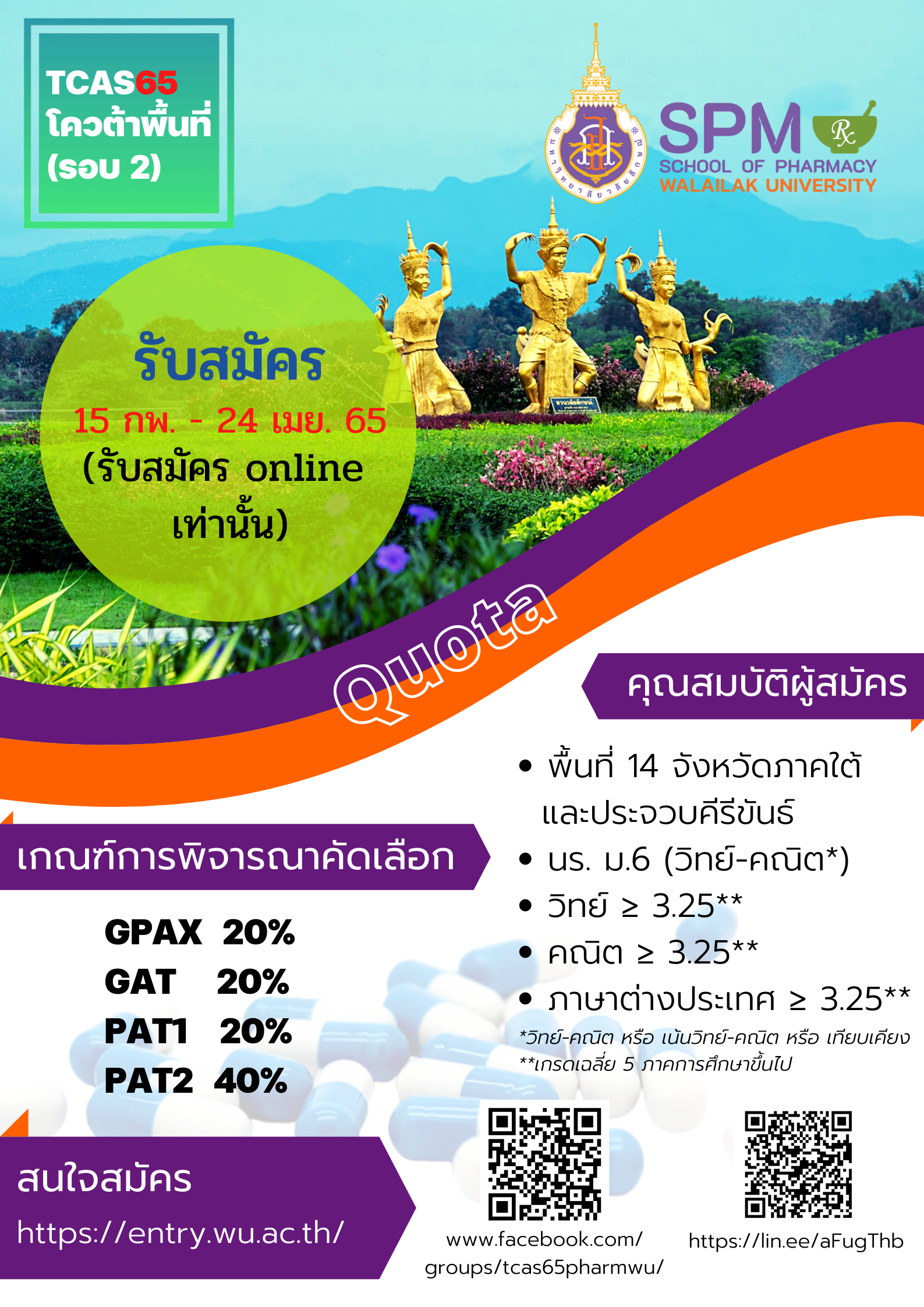 สำนักวิชาเภสัชศาสตร์ มหาวิทยาลัยวลัยลักษณ์ ประกาศรับสมัครนักศึกษาเภสัชศาสตร์ใหม่ ใน TCAS65 รอบ 2 (โควต้าพื้นที่) ซึ่งในรอบนี้ รับจำนวน 30 คน โดยผู้สนใจสามารถสมัครออนไลน์ ได้ทาง https://entry.wu.ac.th ระหว่างวันที่ 15 กุมภาพันธ์ – 24 เมษายน 2565