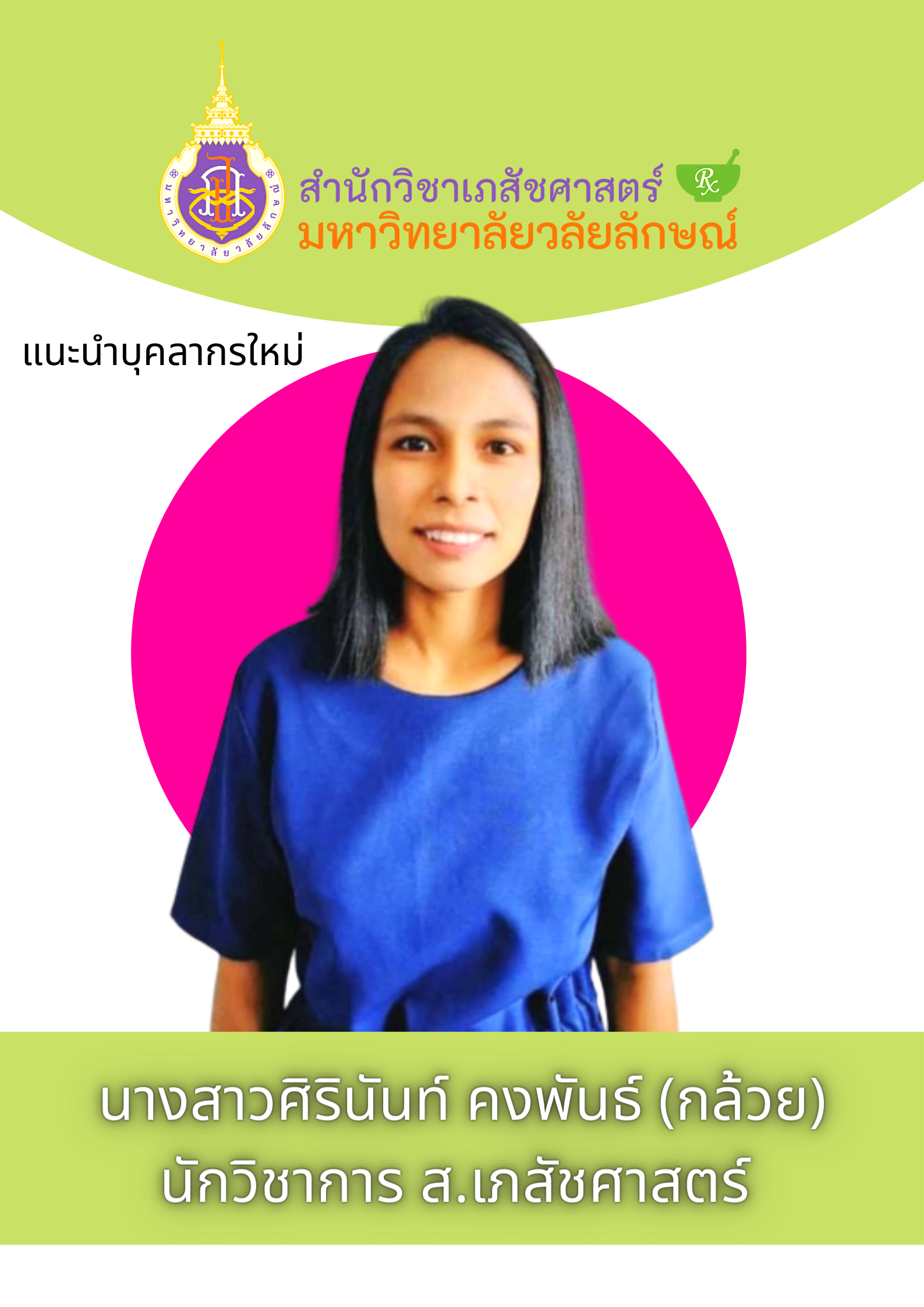 สำนักวิชาเภสัชศาสตร์ ขอแนะนำบุคลากรใหม่ของสำนักวิชาเภสัชศาสตร์ คือ นางสาวศิรินันท์ คงพันธ์ (คุณกล้วย) ซึ่งเริ่มปฏิบัติงานเมื่อวันที่ 2 พฤษภาคม 2565 ที่ผ่านมา