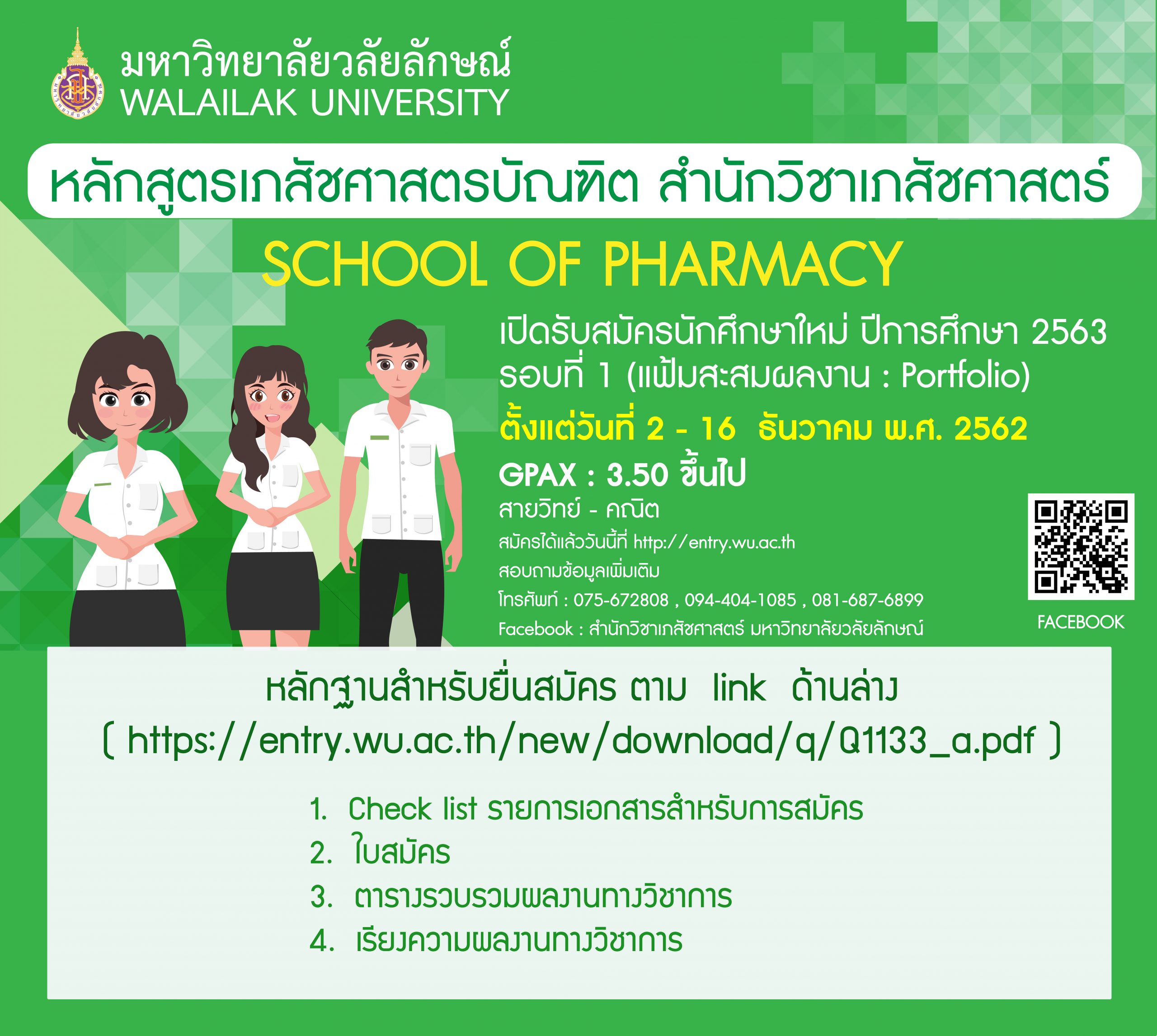 ข่าวการศึกษาปริญญาตรี/โท เอก, ข่าวประชาสัมพันธ์ / ธันวาคม 2, 2019 หลักสูตรเภสัชศาตรบัณฑิต สำนักวิชาเภสัชศาสตร์ มหาวิทยาลัยวลัยลักษณ์ เปิดรับสมัครนักศึกษาใหม่ ปีการศึกษา 2563 รอบที่ 1 Portfolio