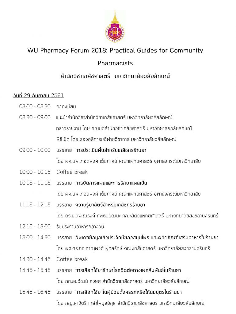 ขอเชิญเภสัชกรเข้าร่วมประชุมวิชาการ WU Pharmacy Forum 2018 “หัวข้อ Practical Guides for Community Pharmacists”