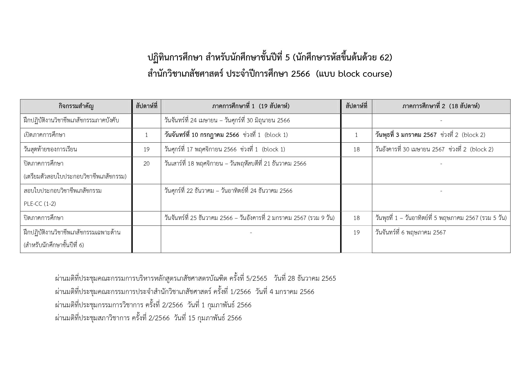 ปฏิทินการศึกษา สำหรับนักศึกษาชั้นปีที่ 5 (นักศึกษารหัสขึ้นต้นด้วย 62)