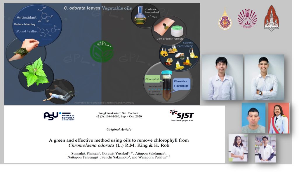 Results from the work which was out of the classroom research of Pharmacy students, School of Pharmacy, Walailak University in the topic “Using vegetable oils to remove chlorophylls from the herbal extracts”. This research work was done by Mr.Attapol Sakdamas and Mr.Nartapol Taluengjit under conducting by Dr.Gorwawit Yoosakul and Miss Suphalik Phaisal and under supervised by Professor Dr.Waraporn Pootalun and Associate Professor Dr, Seiichi Sakamoto. This research team innovated how to prepare the colorless extract of Chromolaena odorata (leaf) for pharmaceutical industrial with wound healing and antioxidation properties. The vegetable oils were applied for removing the chlorophylls from the extractive which was safe than organic solvents. From this knowledge, we can apply in the pharmaceutical industry and also in pharmaceutical education. The School of Pharmacy, Walailak University would say congratulations to this team which the results of these plenty of work were published in the International Journal on SCOPUS database (Q3).