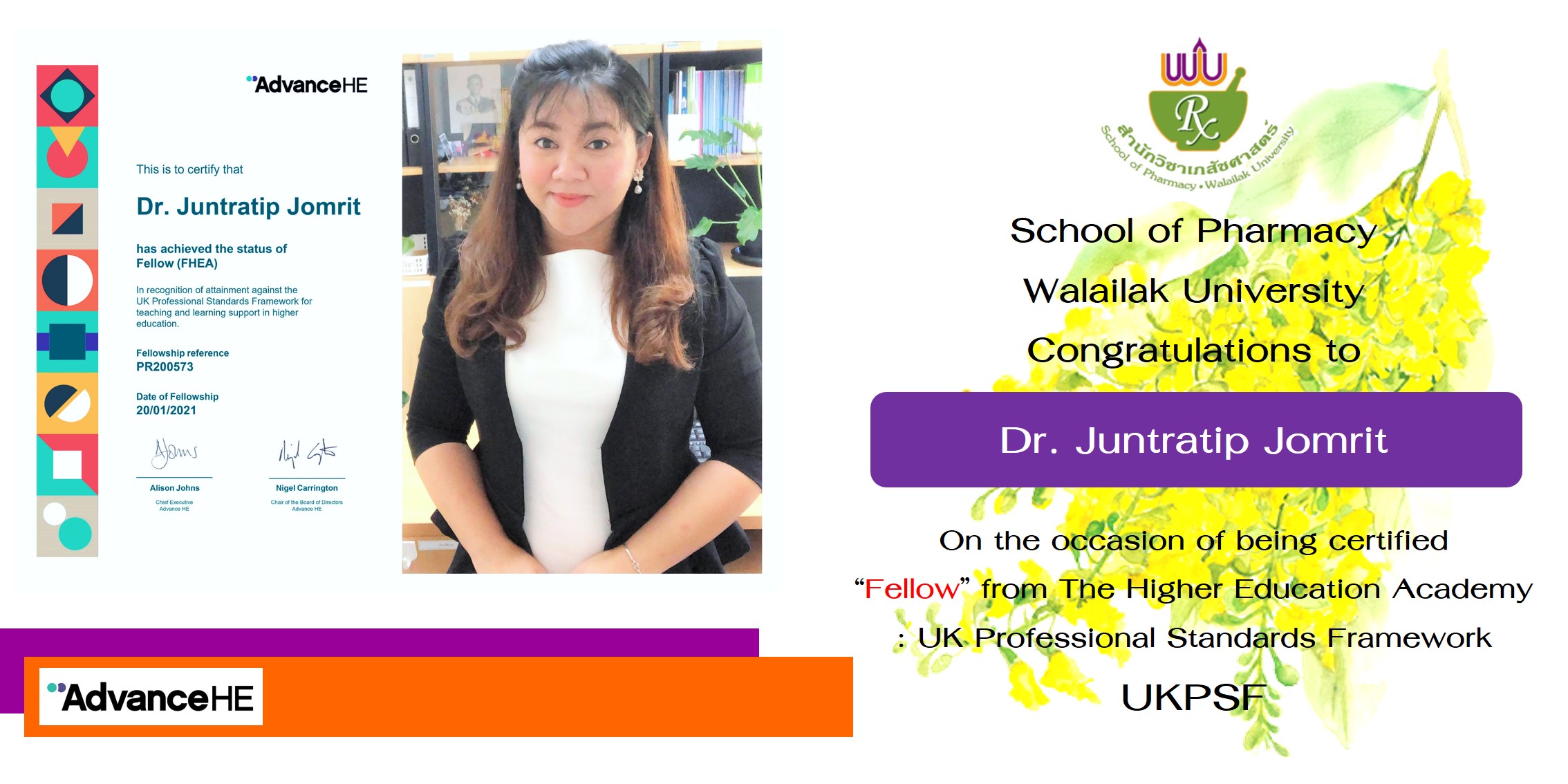 School of Pharmacy, WU would like to congratulate Dr. Juntratip Jomrit on her success in achieving a Fellow of Higher Education Academy (FHEA) through the UK Professional Standard Framework (UKPSF) scheme and become the 19th UKPSF fellow of the school. Dr. Juntratip Jomrit is an academic lecturer in the Pharmaceutical Industry Division of the school (pre-clinic) with teaching and research expertise in biotechnology and microbiology.