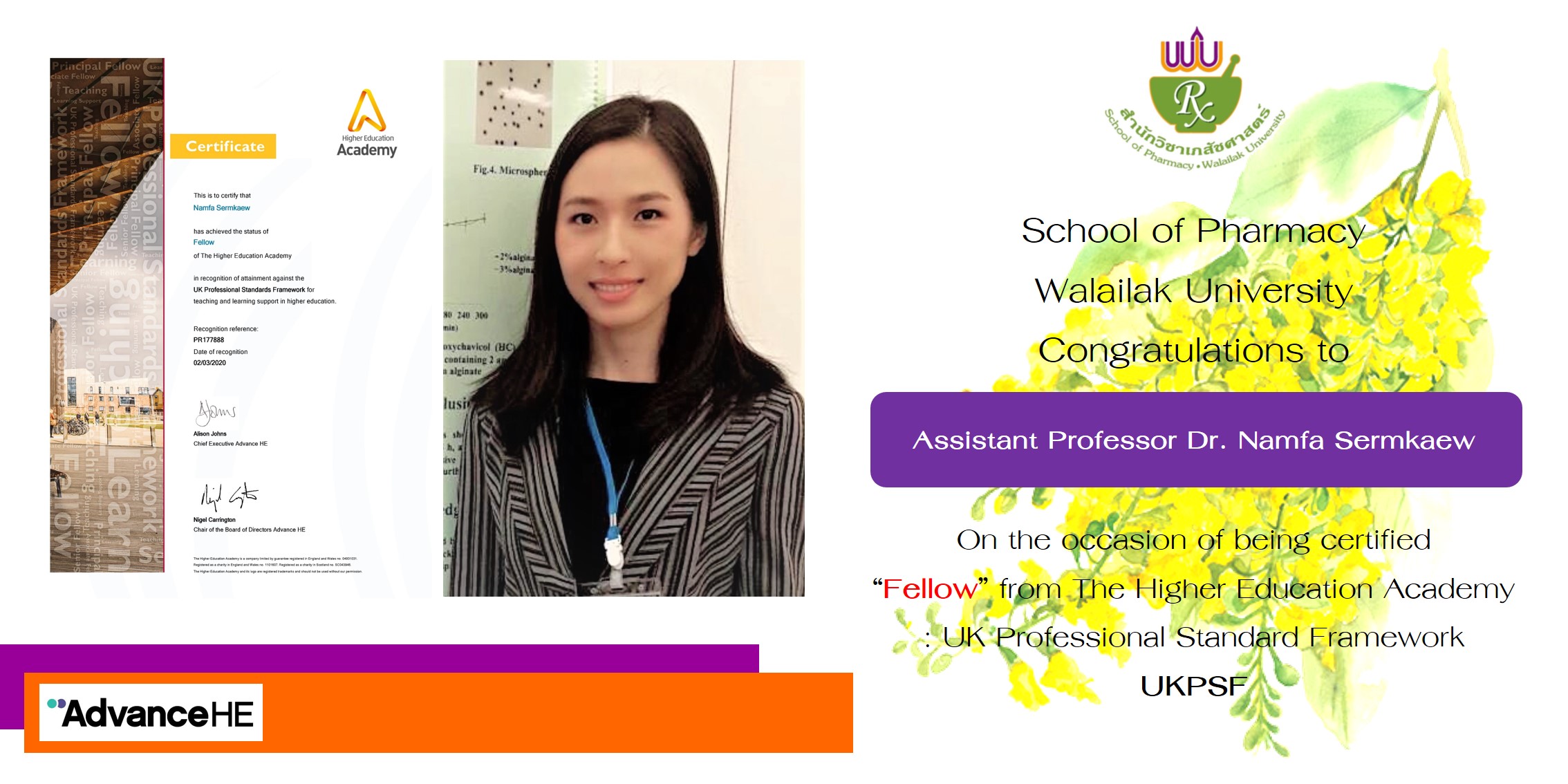 The School of Pharmacy, WU is delighted to congratulate the most recent Fellow of the Higher Education Academy (FHEA), Assistant Professor Dr. Namfa SermKaew